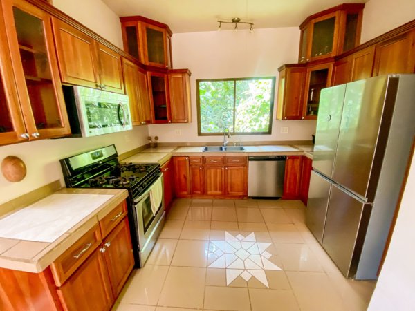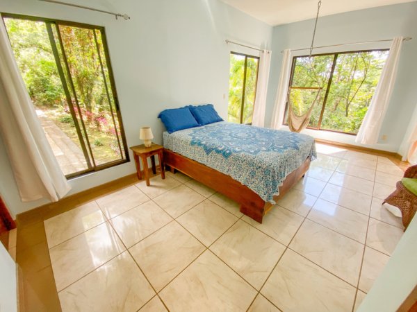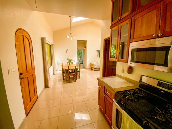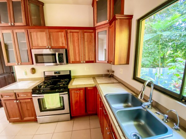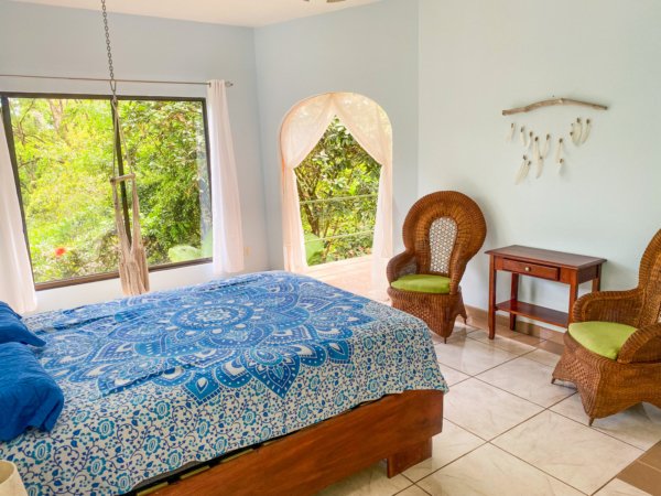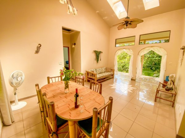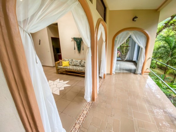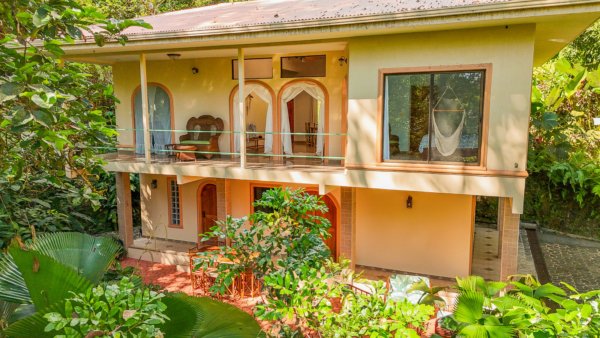 Located high above (but minutes away from) Ojochal’s bustling central area, this home – on two adjacent lots – gives a peaceful oasis in the middle of Costa Ballena’s famous expat enclave. The end-of-road location ensures total privacy & security. The property’s river, swim holes & waterfalls put you in the thick wonderland of a primeval jungle – but a hot barista coffee, a traditional Gallo Pinto breakfast or a fancy dinner are just a quick stroll away! And the wilds of a wildlife corridor span just behind the house – in fact, just 1.5km away, the mountain peaks reach1,100m or 3,600 feet.