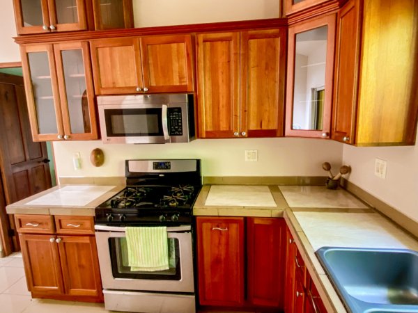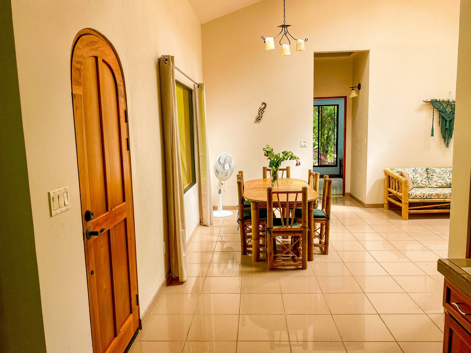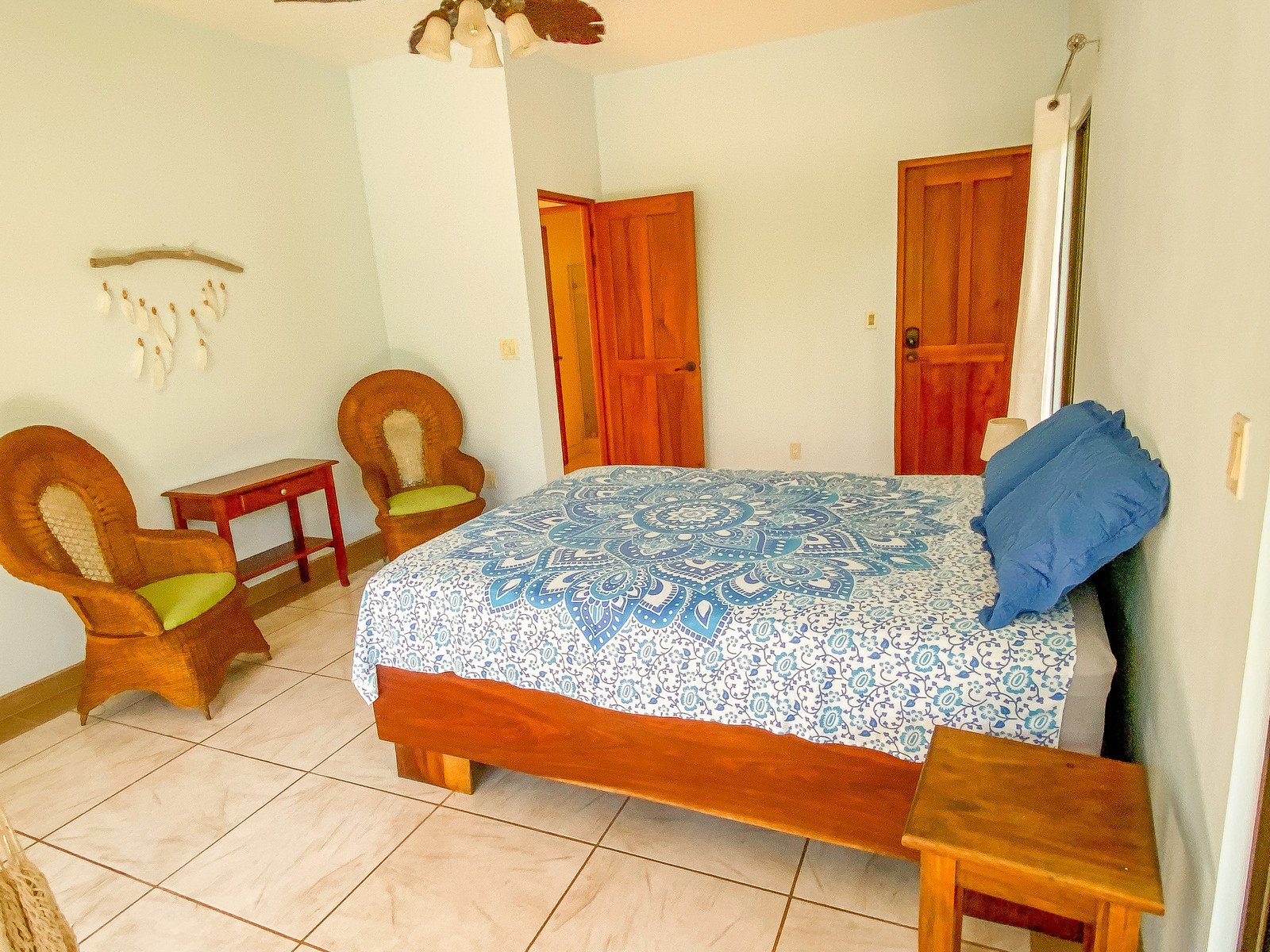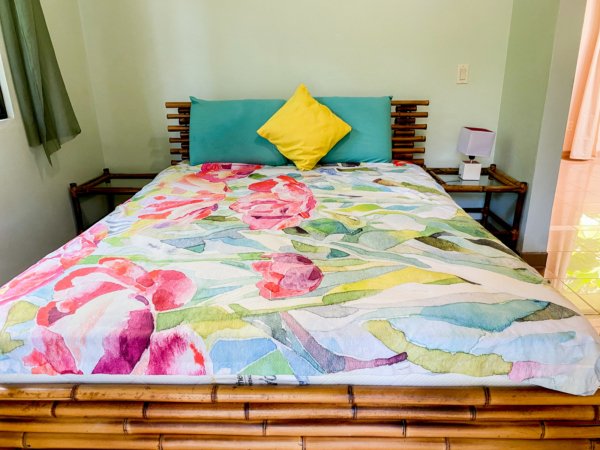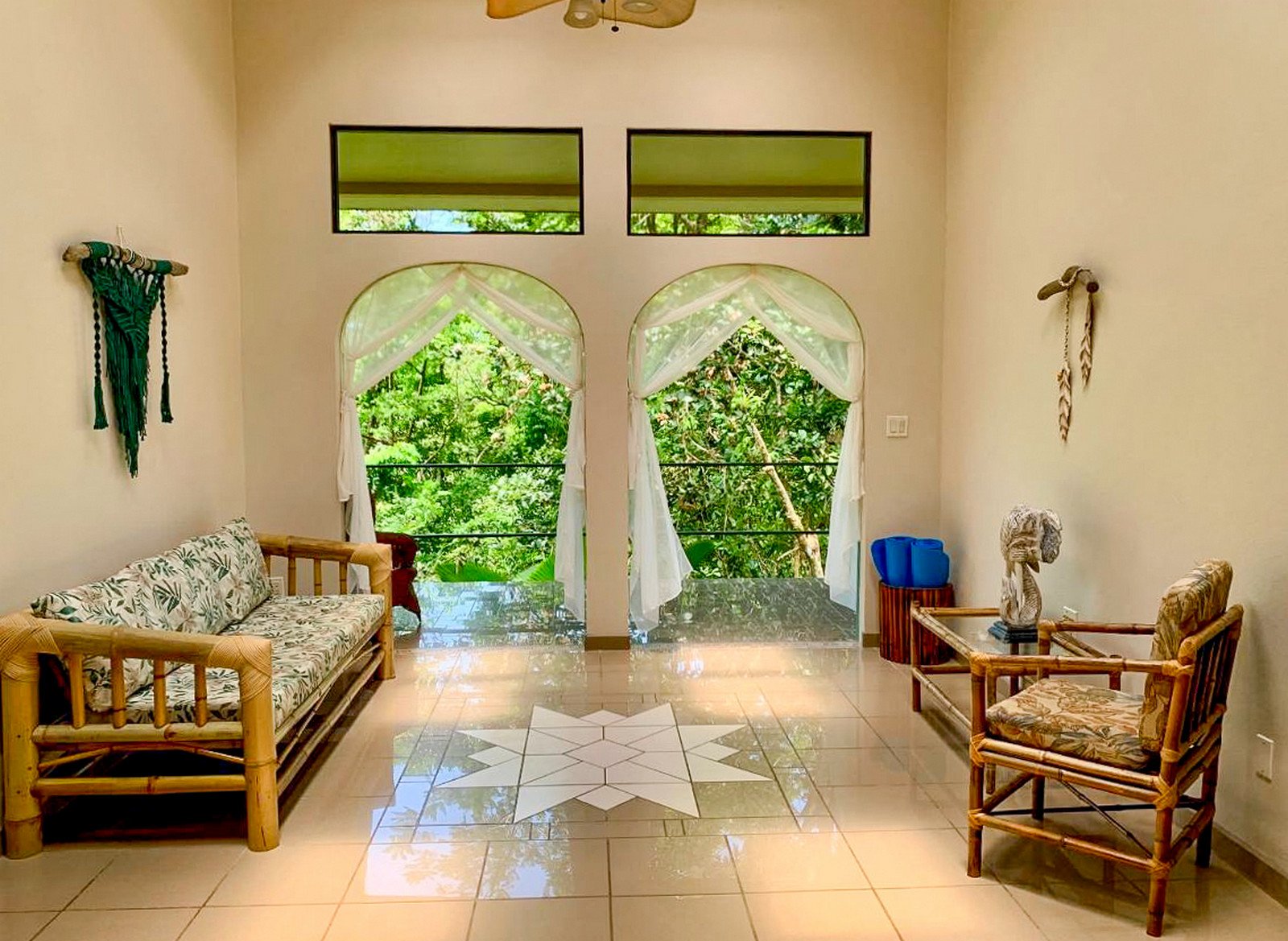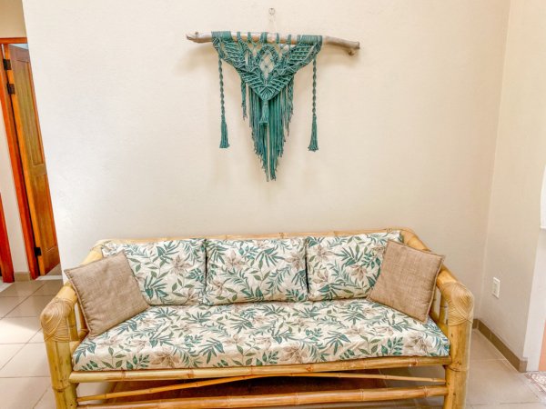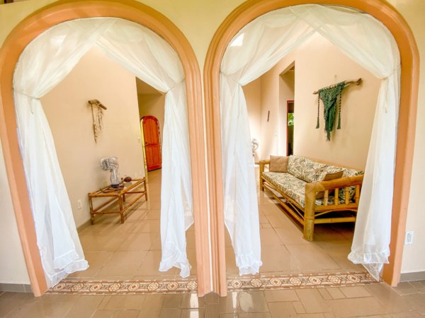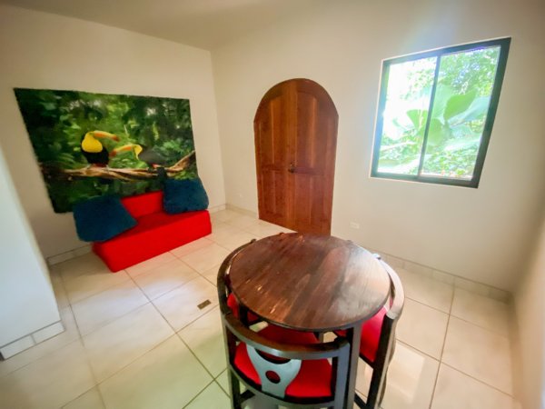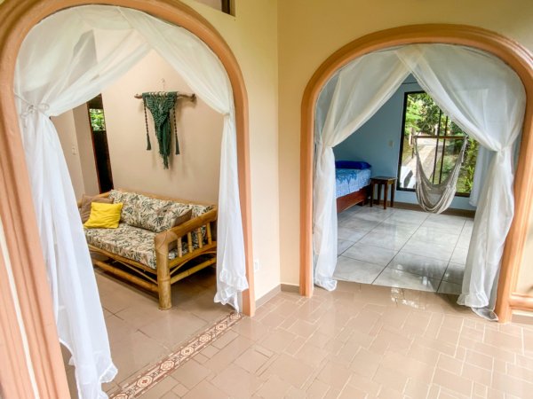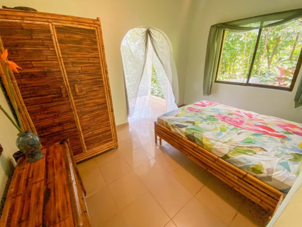 The 192 sqm / 2067 sqf home is fully integrated into the rainforest and takes full advantage of its amazing location. The top level holds a jungle-facing, covered patio which is accessed via four beautiful arched entrances – two in the living room and one arch per each of the two bedrooms. Another bedroom shares this space, as does a large fully-equipped kitchen and a living & chillout area, as well as a shared bathroom. Stunning lumber cabinetry, stone floor tiling and exotic artwork give the house a rainforest-lodge vibe.