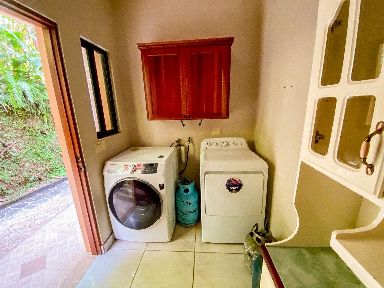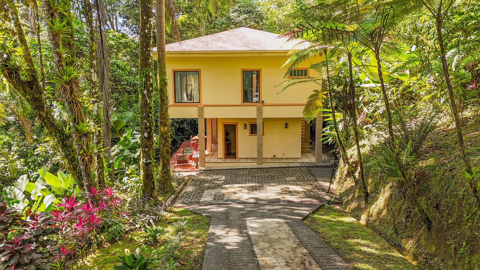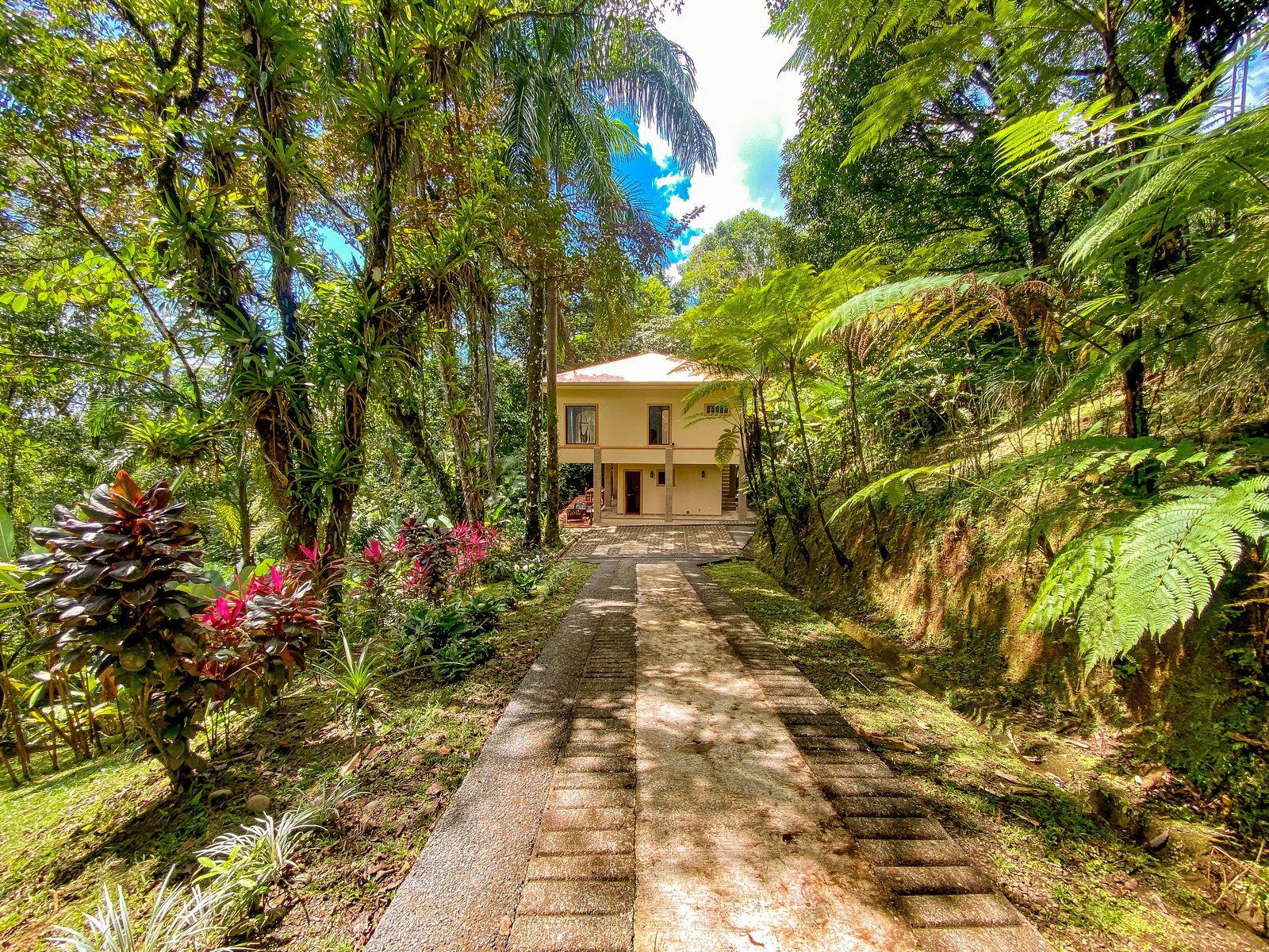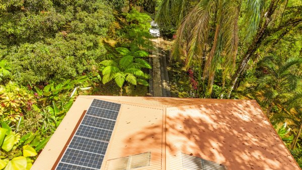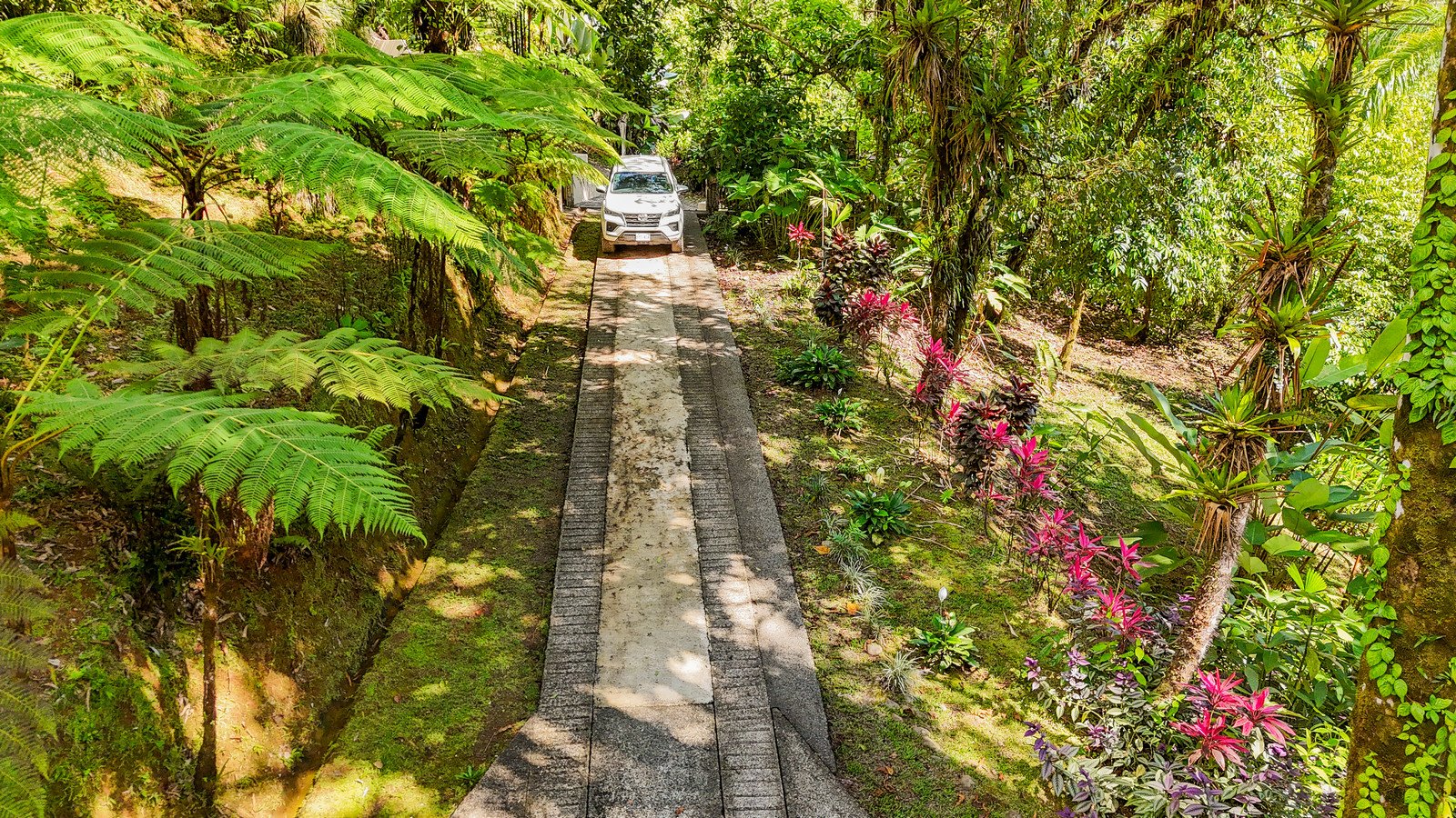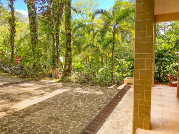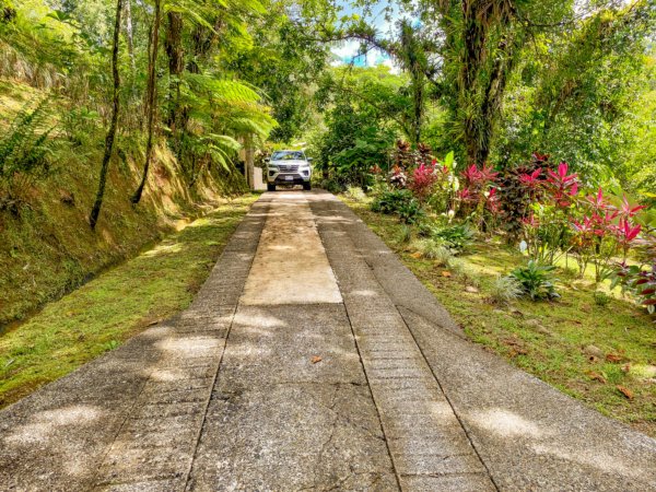 A paved driveway descends through the jungles & manicured parklands to reach a parking area just in front of the house. Elevated to 270m or 890 feet, the home benefits from a cooler climate and refreshing sea & mountain breezes.