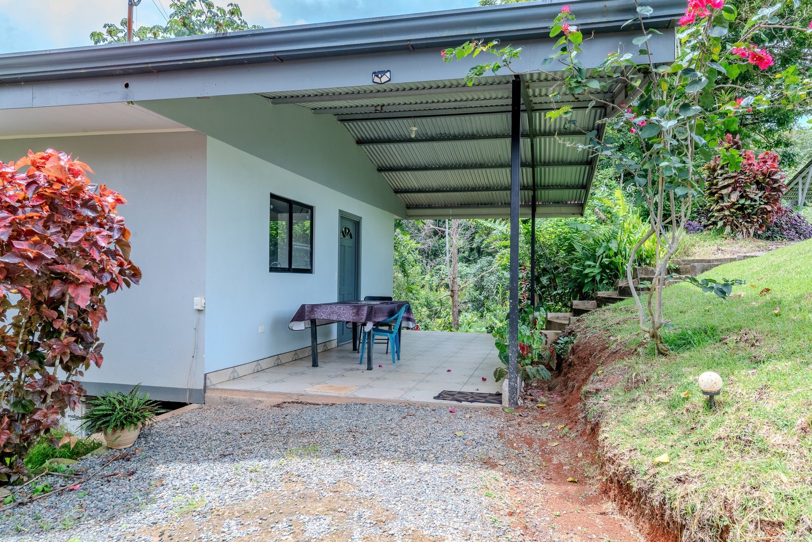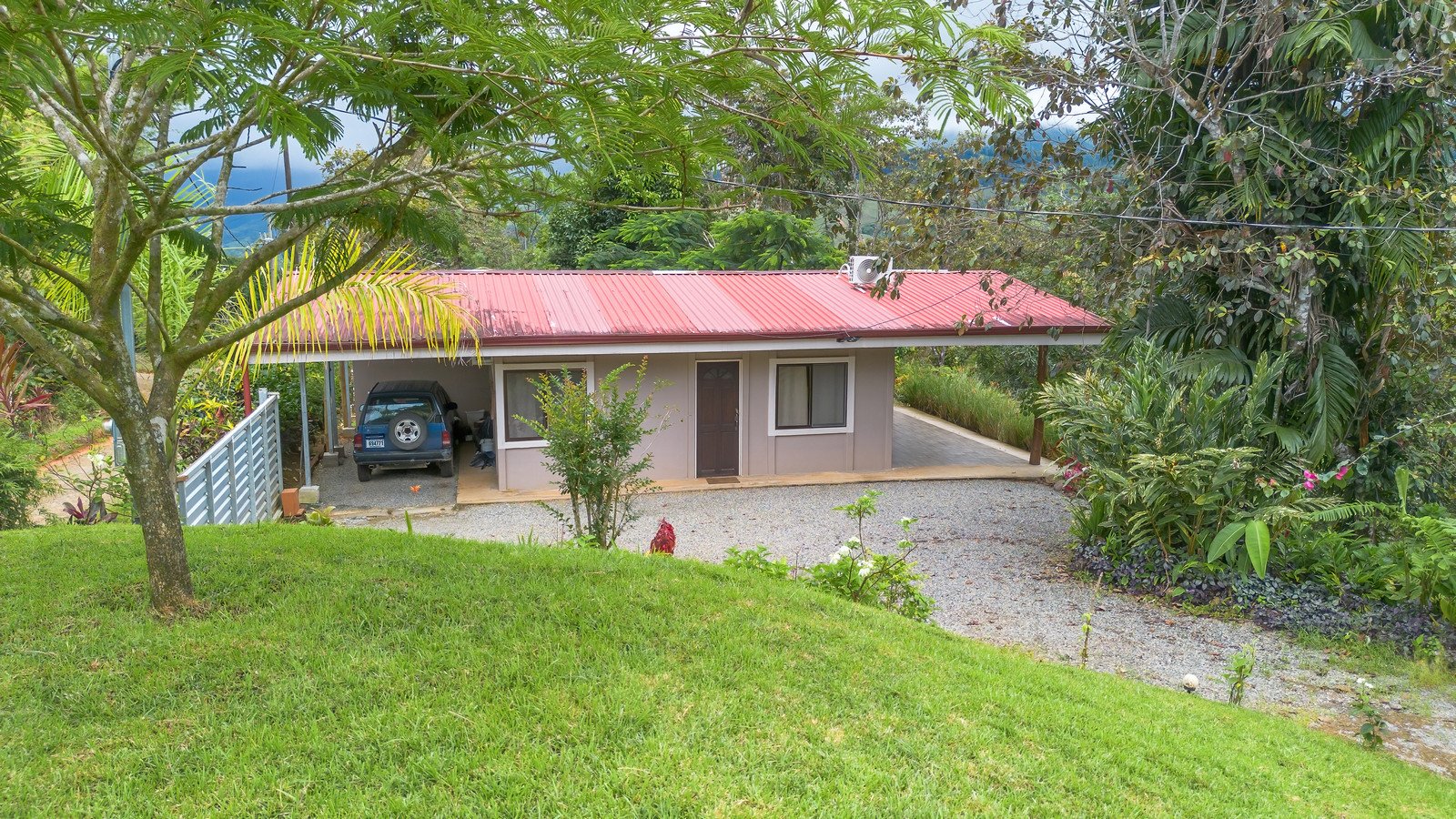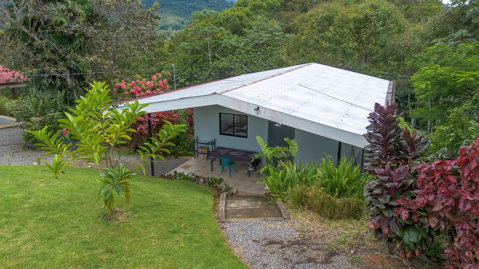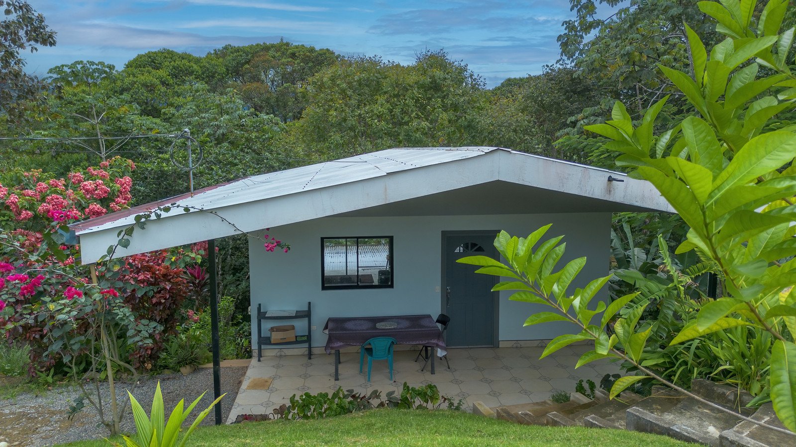 The fourth unit is a charming Costa Rican-style house with its own entrance, manual gate, and two-car carport. It includes two bedrooms, one bathroom, and a well-maintained garden with flowering plants that attract butterflies, hummingbirds, and other local wildlife.