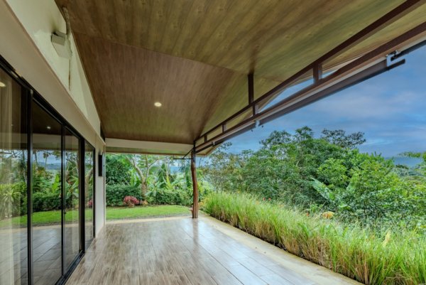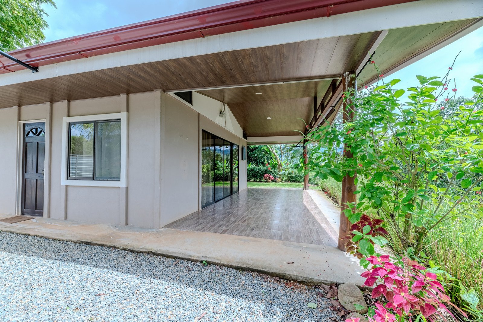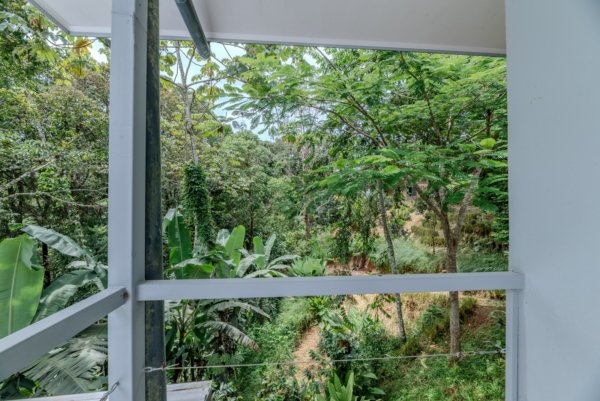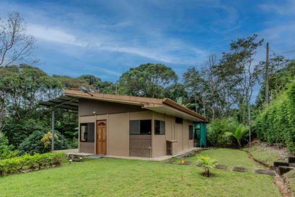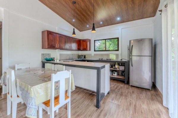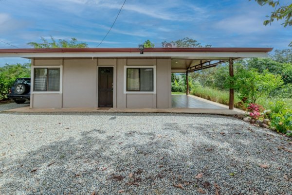 The first home features two bedrooms, one bathroom, a carport, and a spacious covered porch overlooking the jungle. It includes a fully equipped kitchen, air conditioning, and solid concrete prefab construction with PVC ceilings. The home has its own electric gate, a private garden, and plenty of green space.