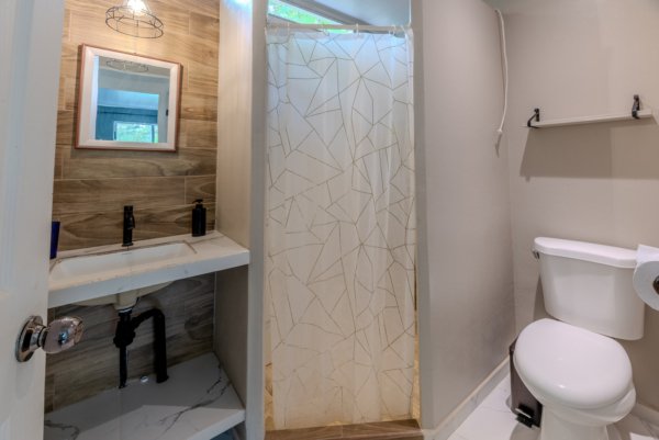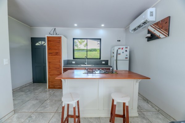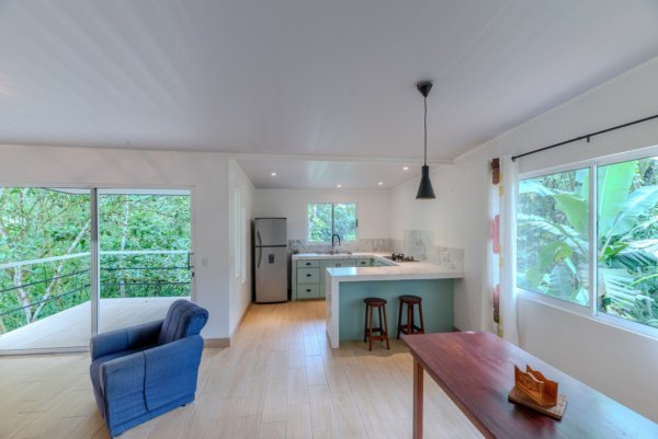 The second structure is a two-level modern duplex with an open layout. The upper level includes one bedroom, a bright kitchen, a large bathroom, and a generous balcony facing the jungle canopy—the perfect spot to enjoy morning coffee while listening to the calls of howler monkeys and tropical birds. The lower level, set partially below ground, offers two bedrooms, one bathroom, a spacious living area, and a kitchen with porcelain countertops and elegant cabinetry. Large windows fill the space with natural light and create a peaceful connection with the surrounding forest.