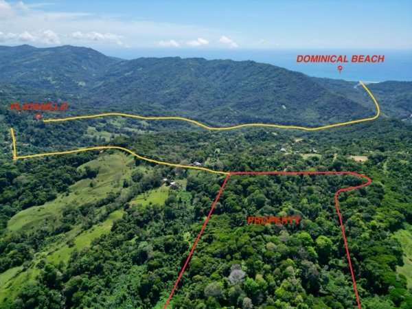The property is located in Platanillo, Fila Cacao, just 7 minutes from the town center of Platanillo and approximately 20 minutes from Dominical Beach. It sits on a secondary road that dead-ends about 1.5 kilometers ahead, meaning very little traffic. The property also offers approximately 80 meters of frontage on a public road.