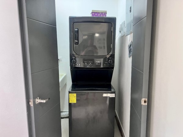 The main level boasts an open-concept floor plan ideal for entertaining. The kitchen is equipped with stainless steel appliances, including a refrigerator, electric stovetop and oven, and dishwasher. The wraparound countertops feature bar seating, seamlessly connecting to the indoor dining area and a second bar-style counter behind the living room, making it perfect for gatherings. A full guest bathroom is conveniently located just off the entryway along with a laundry closet equipped with washer and dryer.