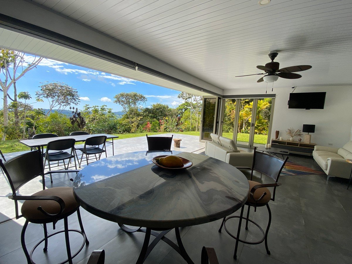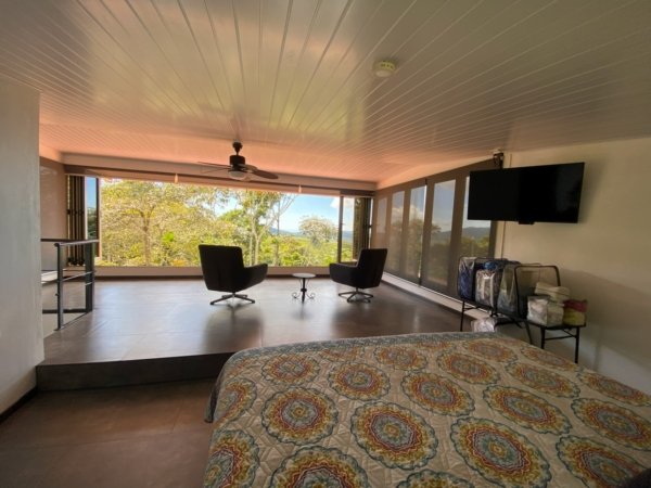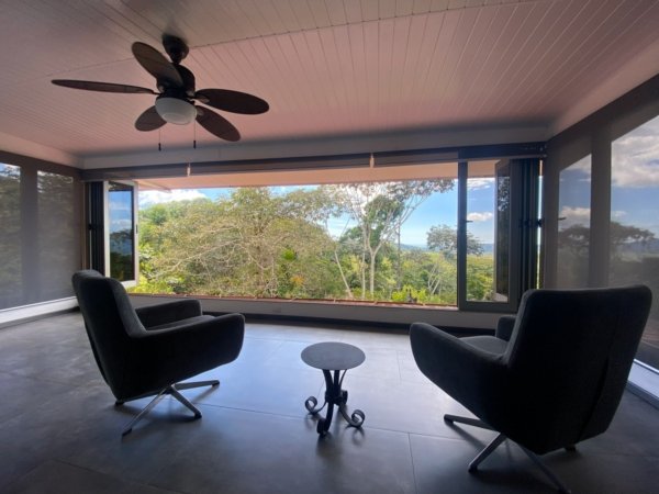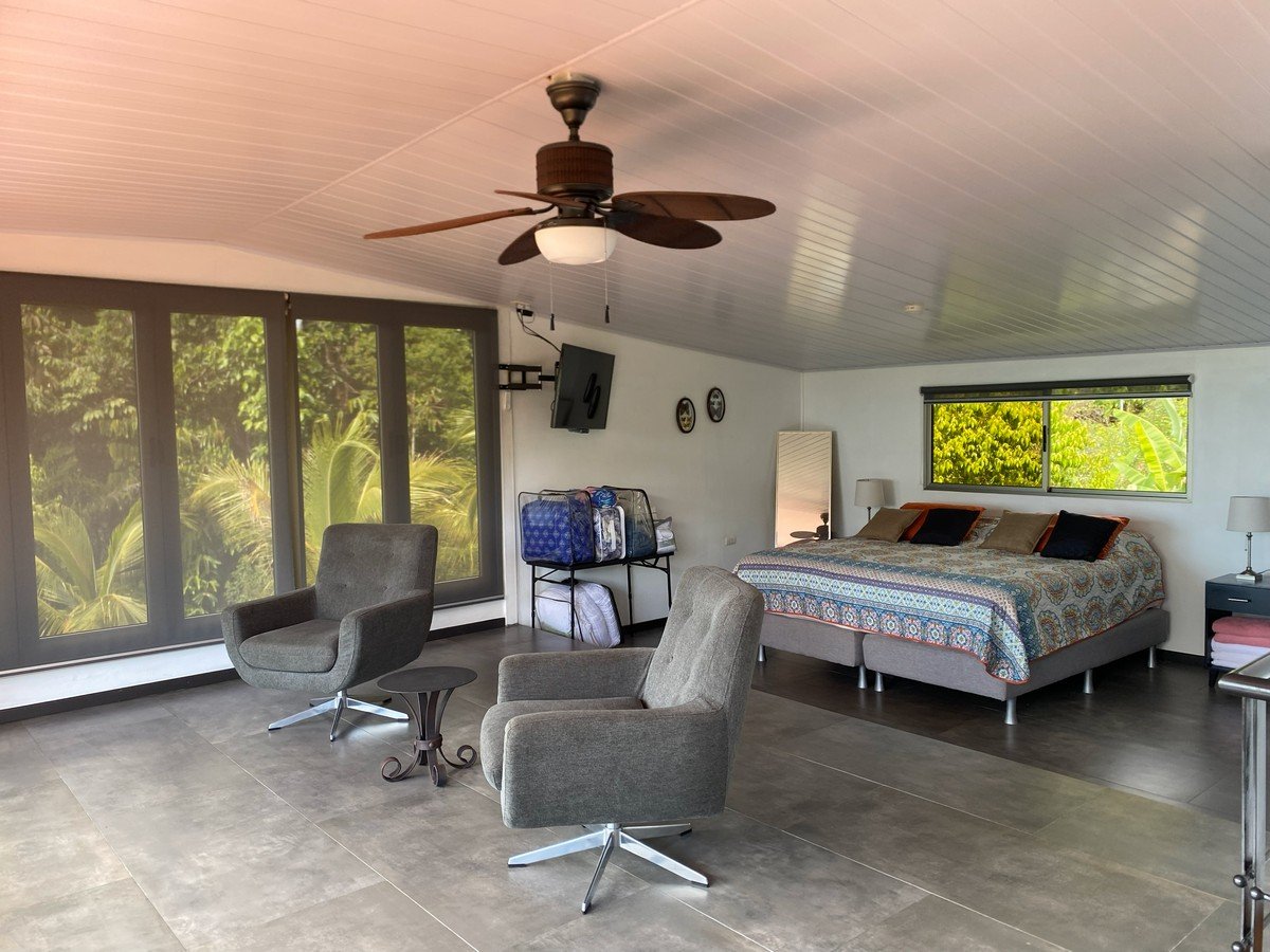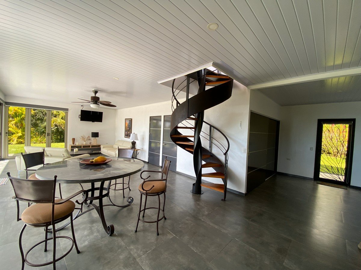 The second floor houses the primary bedroom, which features sliding windows and offers stunning mountain views along with a distant ocean view. Thanks to its elevated and well-thought-out design, the home does not require air conditioning, as natural airflow keeps the interior cool and comfortable throughout the year.