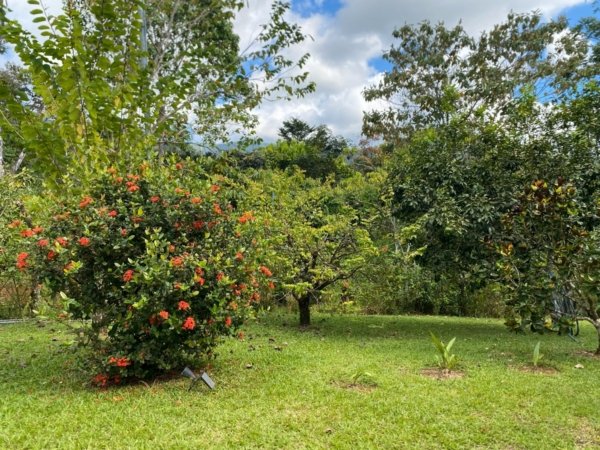 The home features two bedrooms and two bathrooms and is designed with an open-concept layout that integrates a spacious living area and a large kitchen, creating a bright, comfortable, and well-ventilated space. From the main living areas, you can enjoy beautiful mountain views, while the outdoor area offers open grassy spaces and a wide variety of mature fruit trees, perfect for enjoying the outdoors.