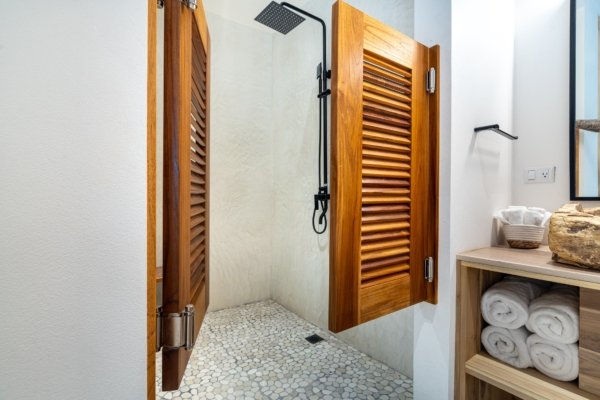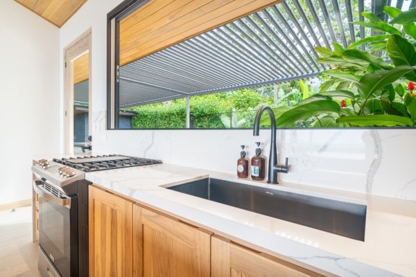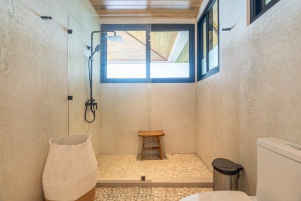 Just steps from the main house, the guest casita includes its own private patio, accordion doors that open to vast ocean views, a compact kitchen, and a full bath. Enjoy an outdoor shower surrounded by nature for the ultimate tropical experience.