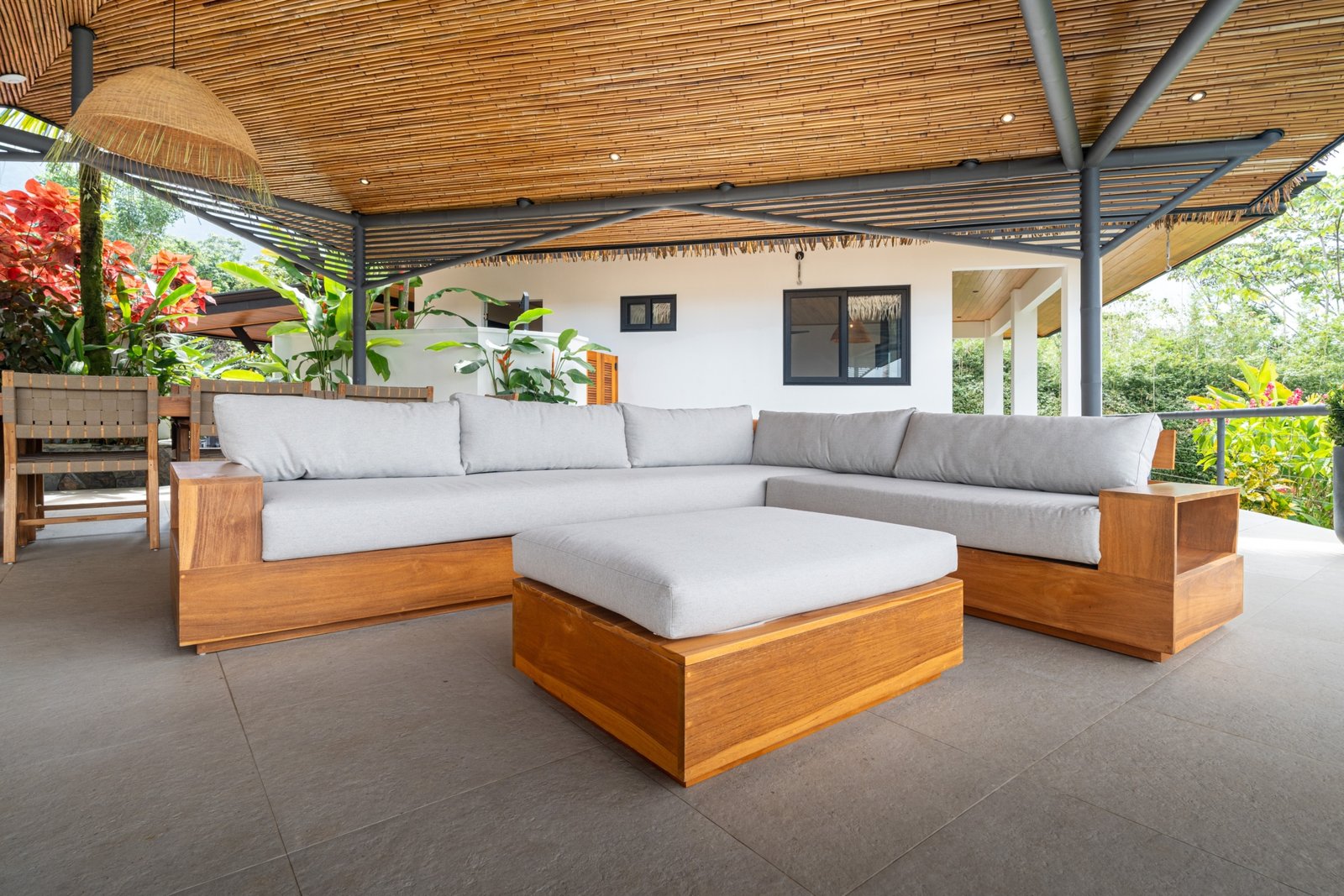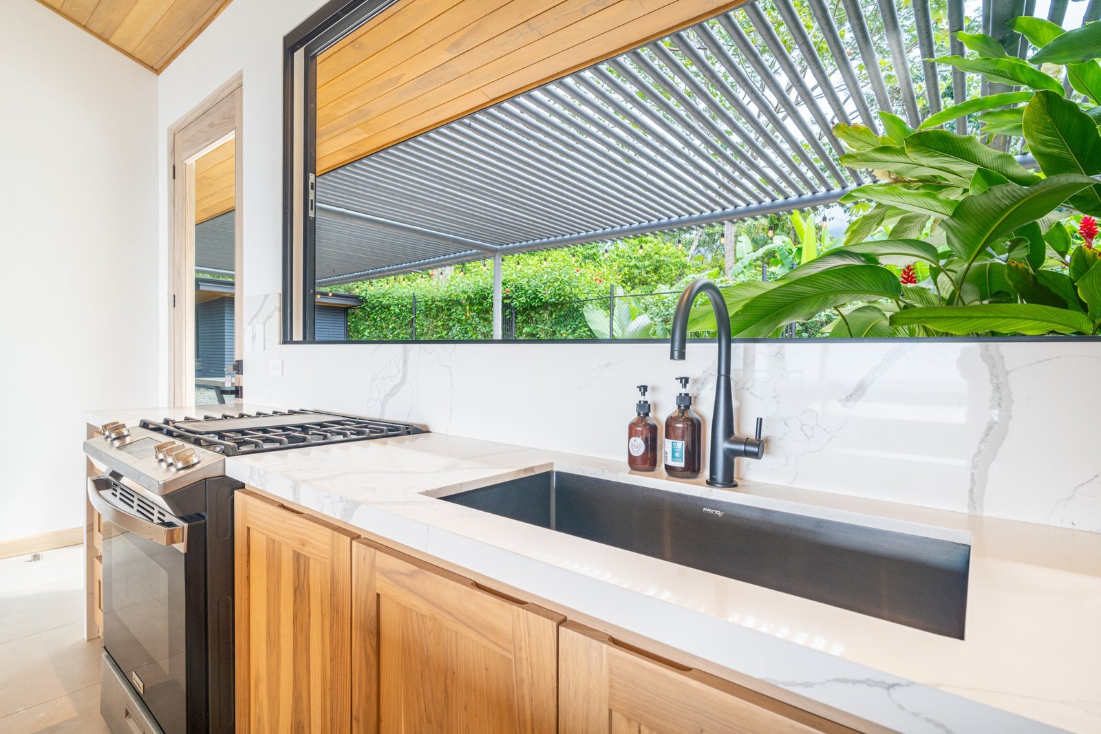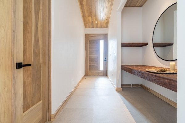 From the moment you arrive at Casa Amarilla, you’ll notice the solid block construction, artisan teak finishes, and intentional design that exudes warmth and sophistication. A covered carport and electric gate welcome you into the property, leading to the main residence and a separate ocean-view casita.