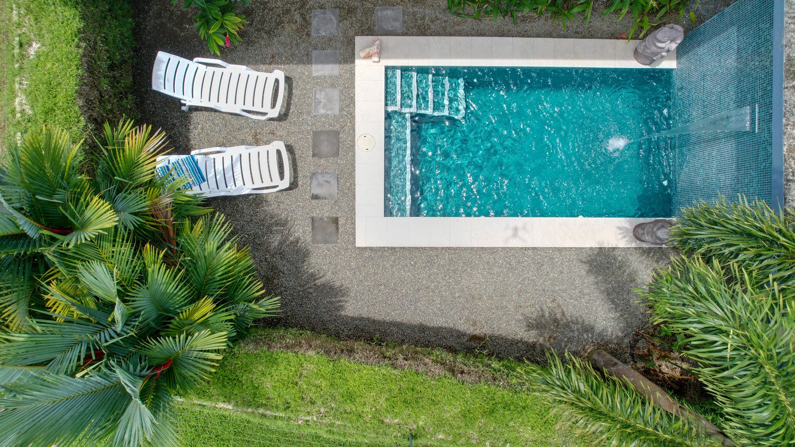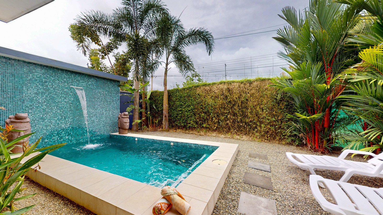 Private swimming pool with a waterfall feature