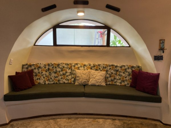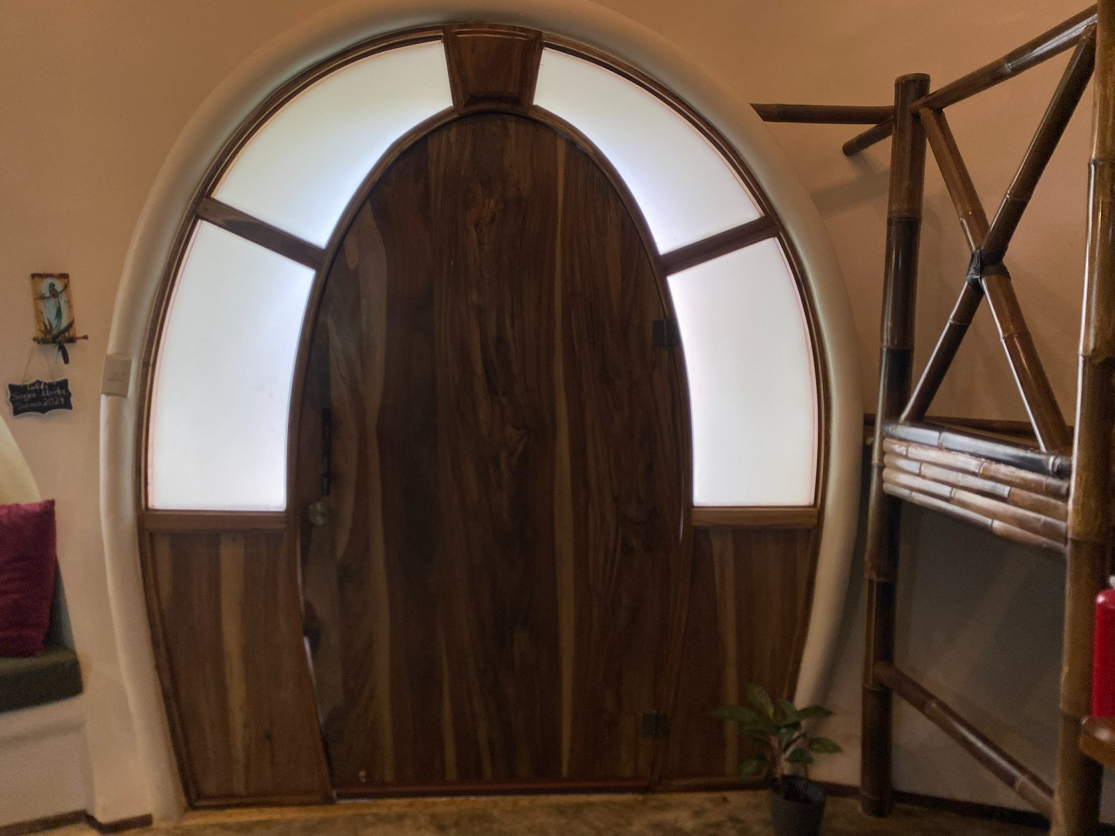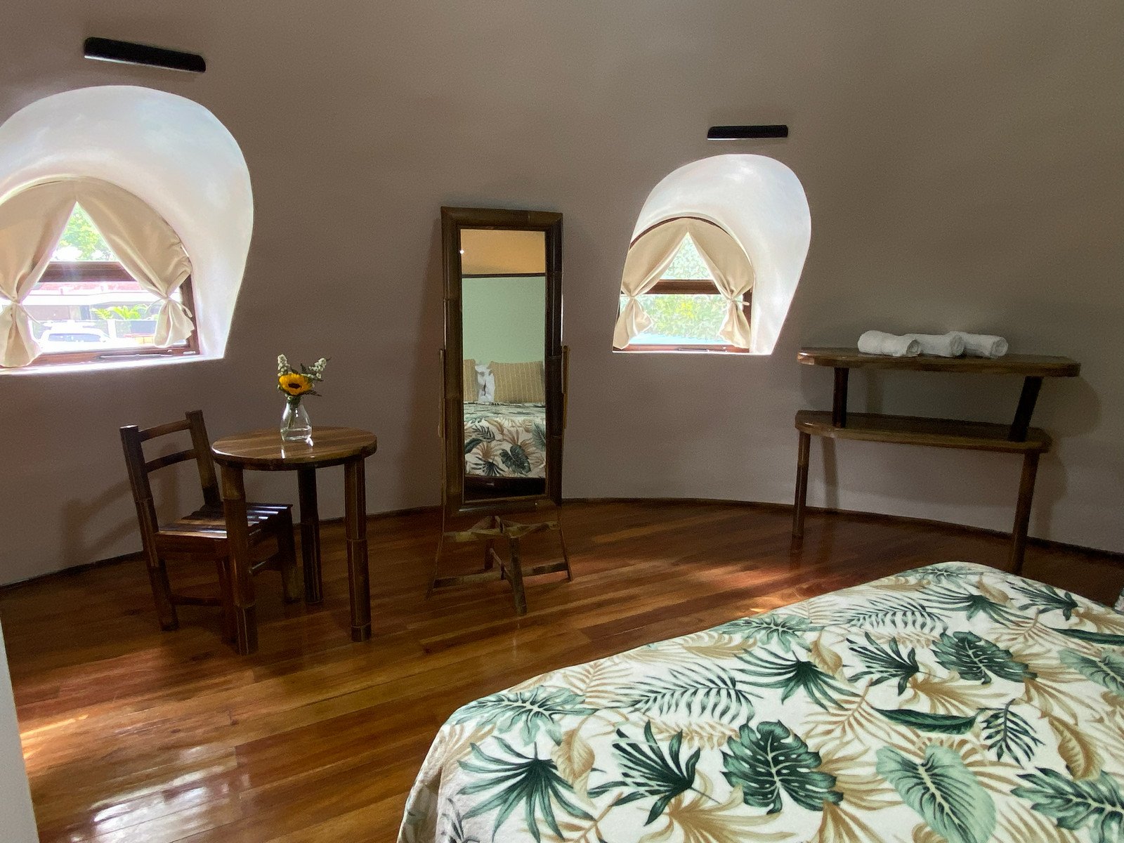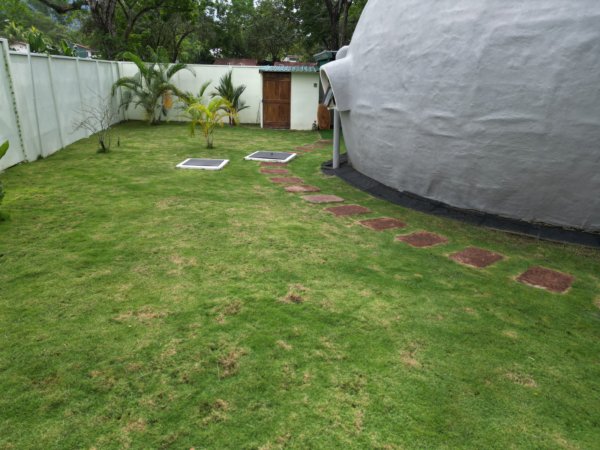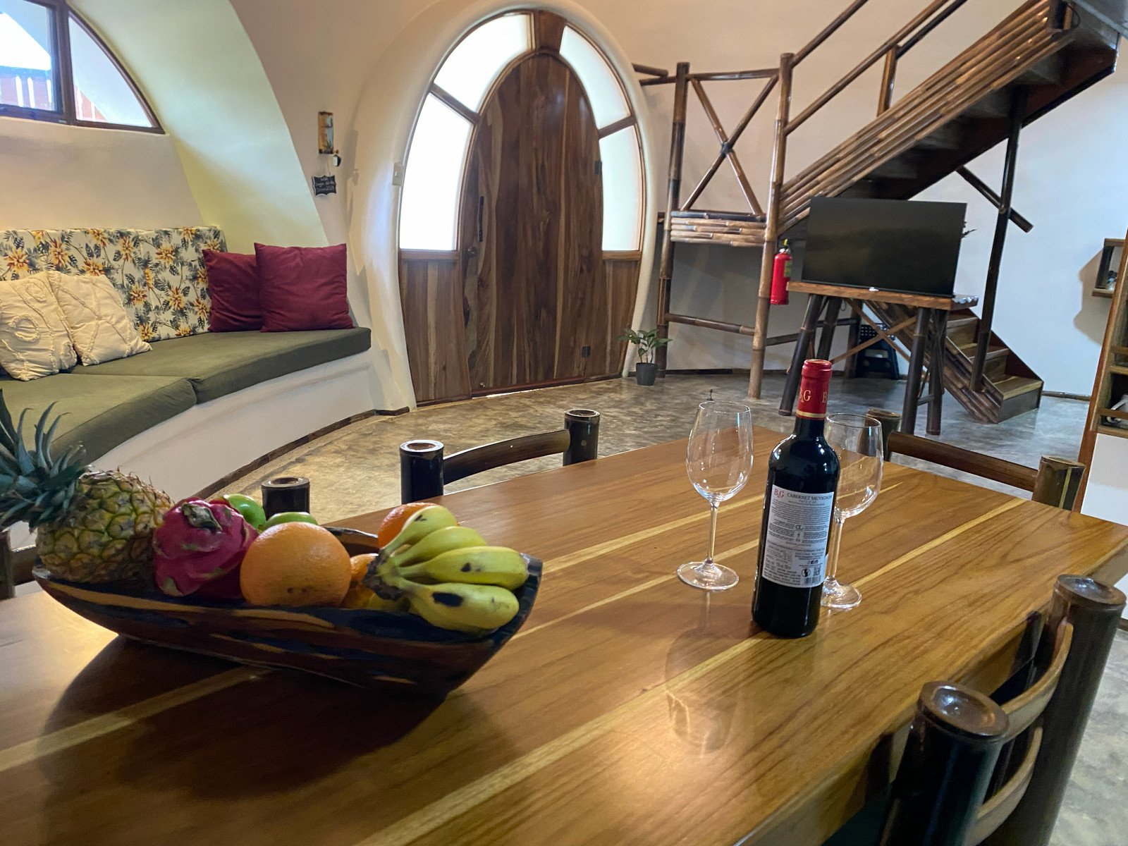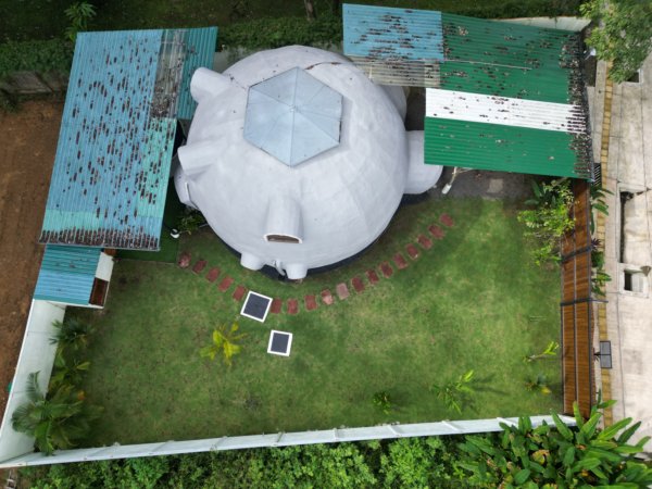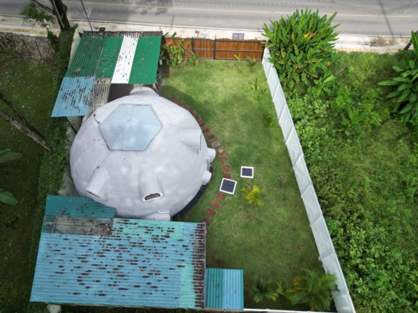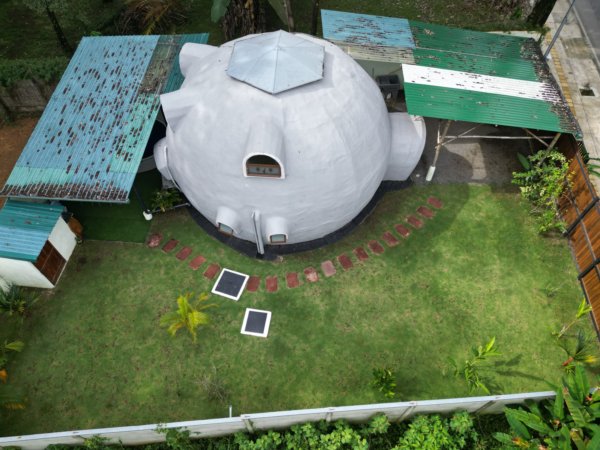 The home was built with solid, durable materials, and the interior furniture was custom-designed specifically for the dome using wood and bamboo. It gives the space a warm, natural character that fits perfectly with the tropical surroundings.