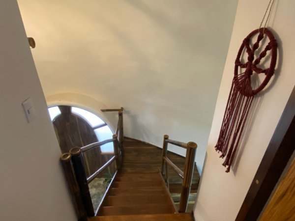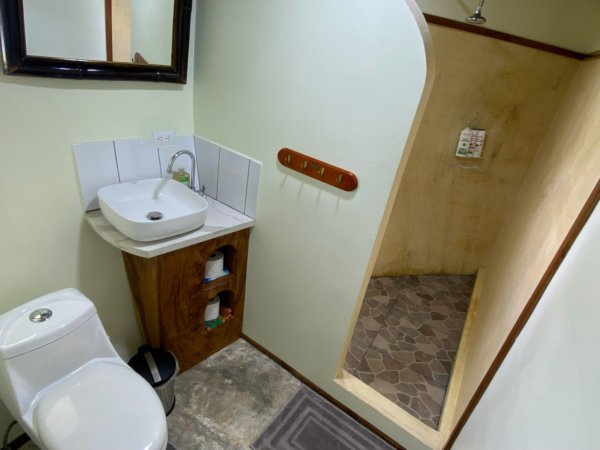 Standing 7 meters tall, this two-level structure feels open, unique, and surprisingly comfortable. The primary bedroom with its private bathroom is located upstairs, creating separation and privacy. Downstairs you’ll find the guest bedroom, living area, and kitchen, all integrated in a practical and inviting layout.