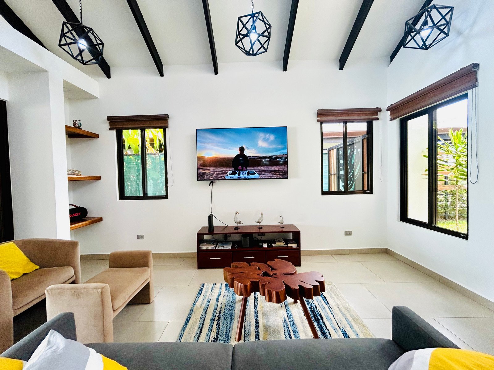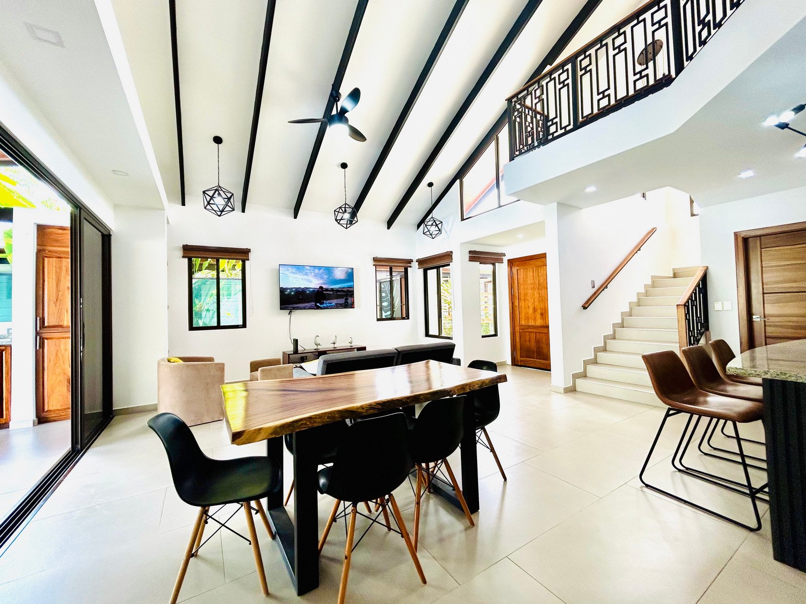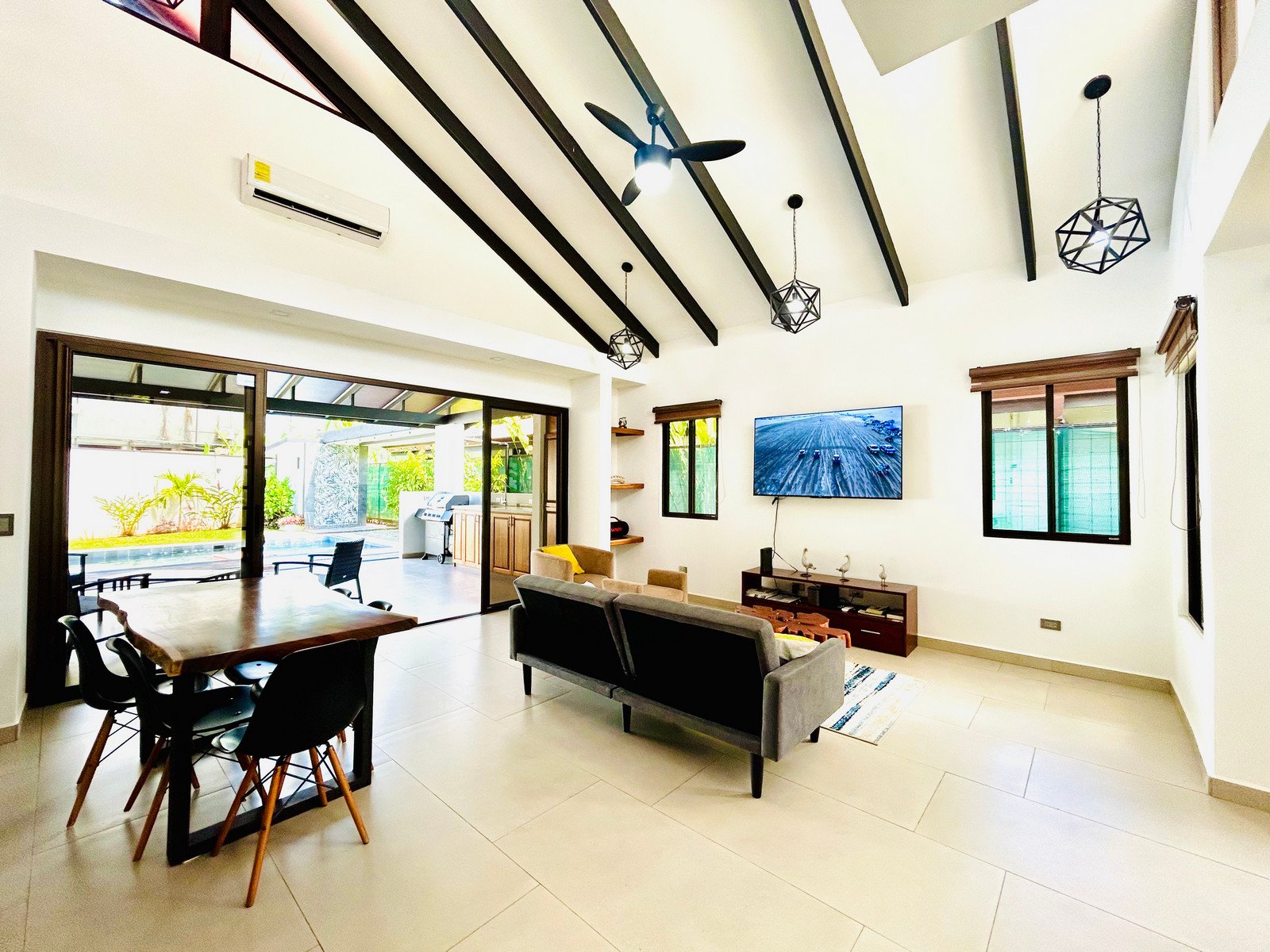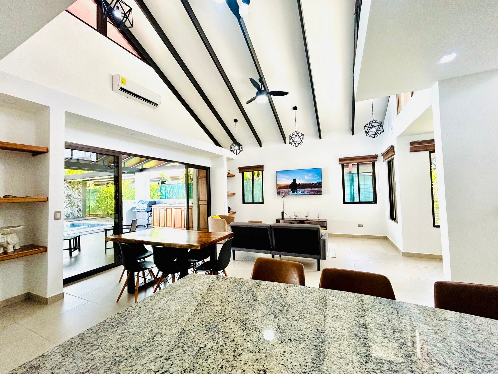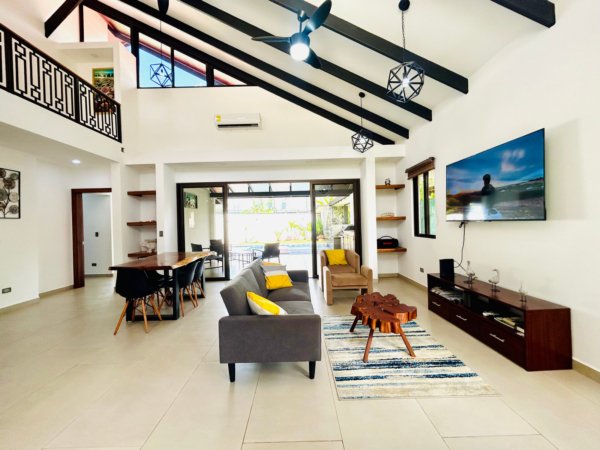 Completed in January 2025, the home was designed to embrace Costa Rica’s indoor-outdoor living. Large sliding glass doors open directly to the pool and garden, creating bright and airy living spaces filled with natural light and tropical breezes.