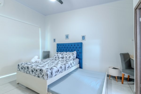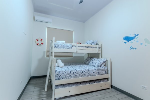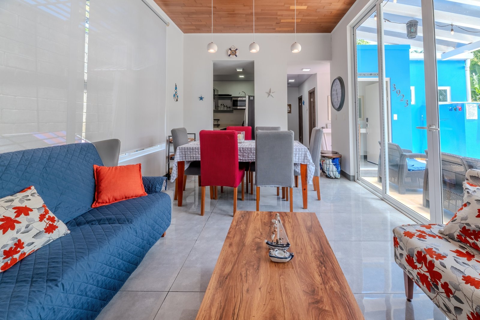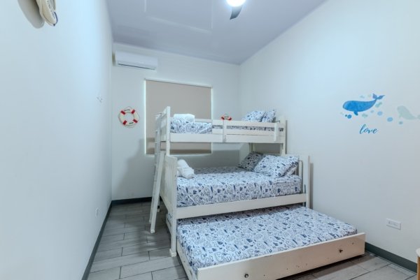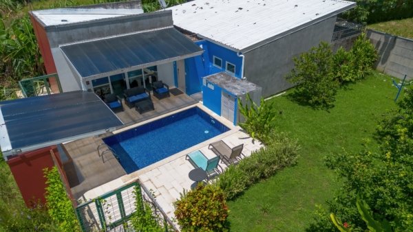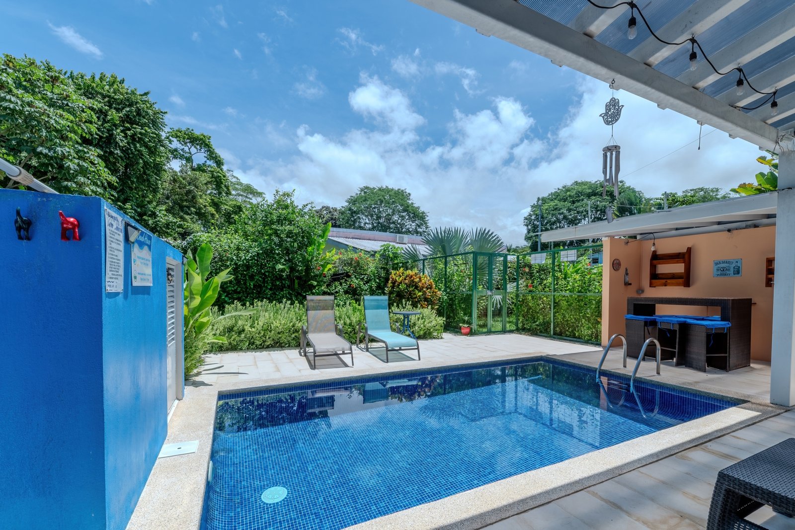 Designed with versatility in mind, the layout is Airbnb-optimized with bunkbeds and trundle beds to accommodate families or larger groups. The outdoor area includes a good-sized swimming pool and a covered pool bar with space for grilling, ideal for enjoying the tropical climate. The fully fenced yard is landscaped with grass, green gardens, and a selection of fruit trees, while leaving space for additional construction or future improvements.