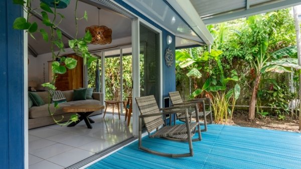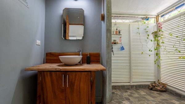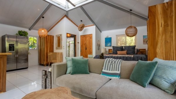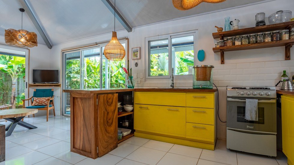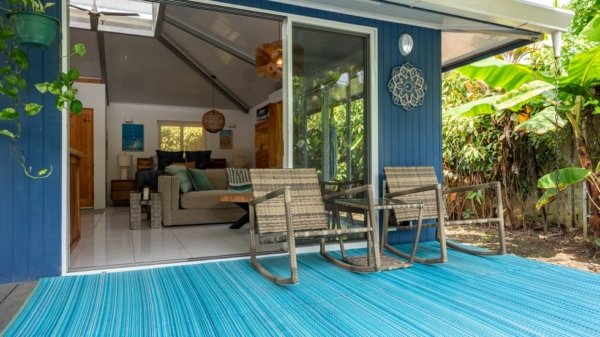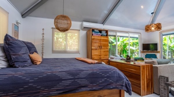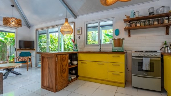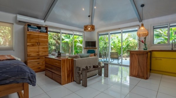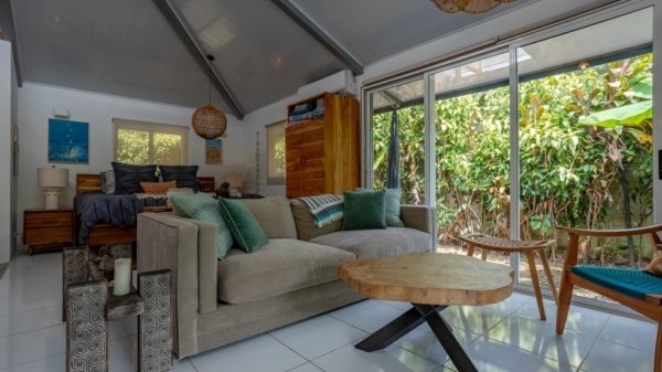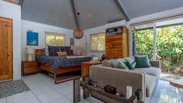 The floor plan for the house is a studio that comes complete with a remodeled kitchen, a full bathroom, and custom-made wooden furniture. The newly crafted wooden bed frame was designed for storage underneath. The house features large sliding glass doors that allow plenty of natural light to enter. The doors open onto a covered balcony that overlooks the large backyard and garden area. This is a great space for backyard BBQs or simply enjoying the green space filled with flowering plants and fruit trees.