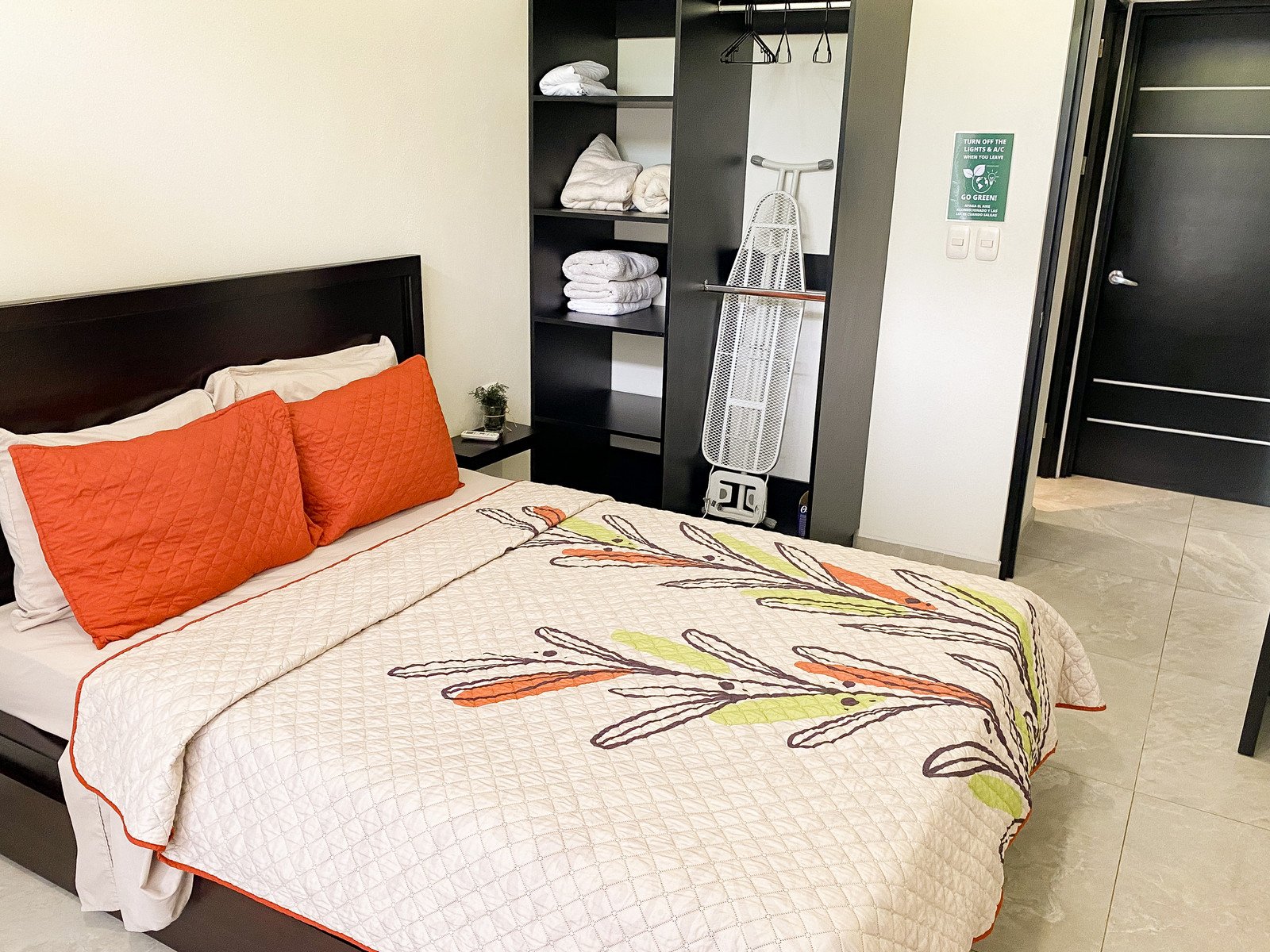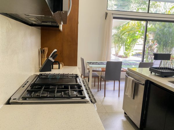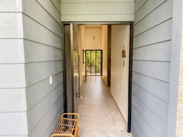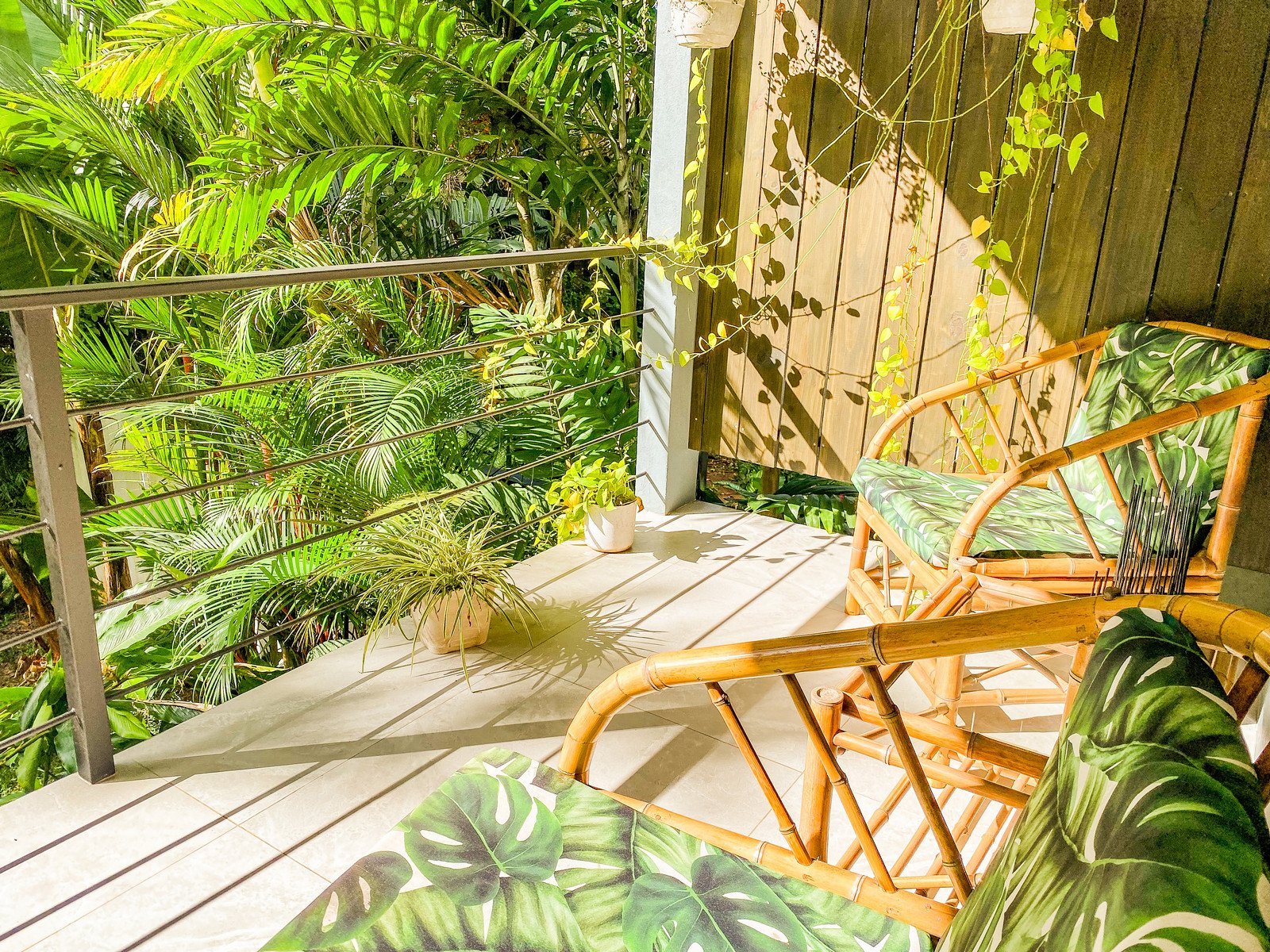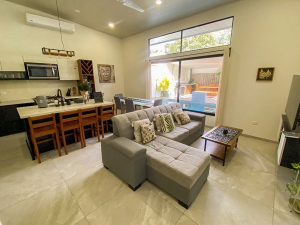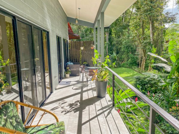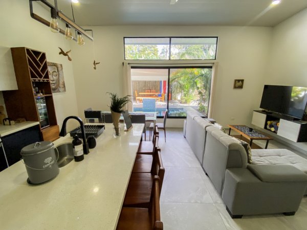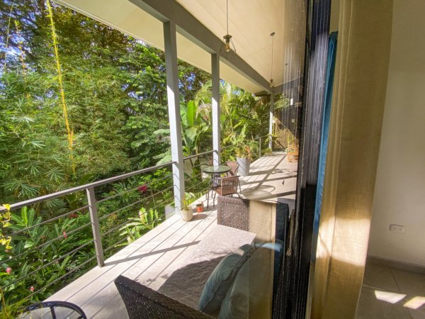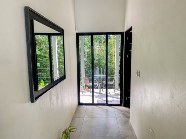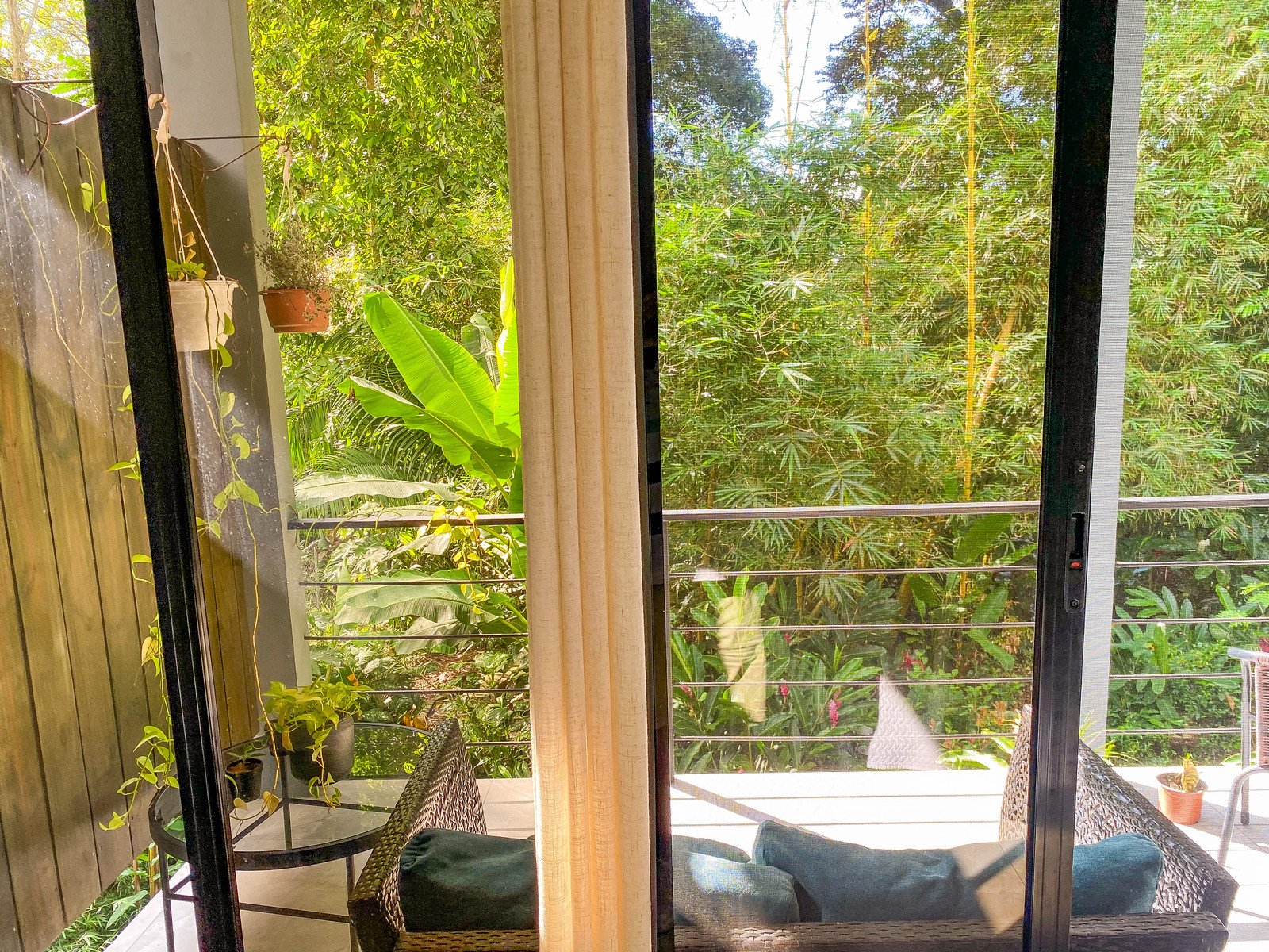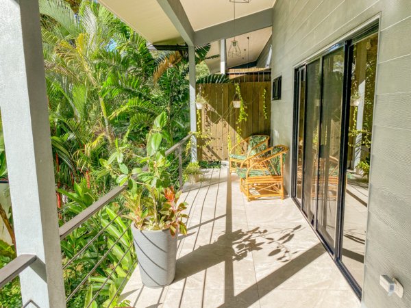 Step through the front entrance into a breezy hallway that leads straight to the jungle-view deck. To the right, the open-plan living space includes: