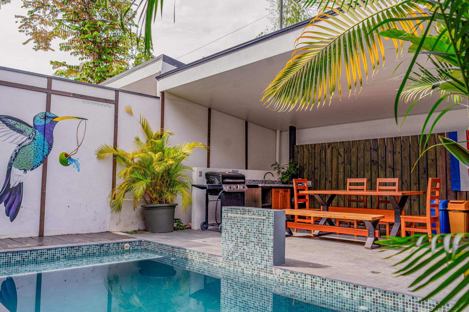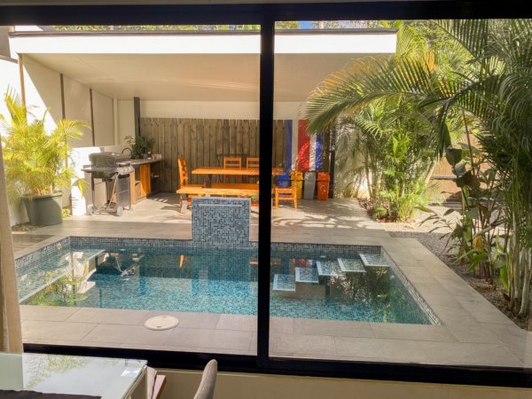- Windows framing the pool, BBQ pavilion, and lush greeneryÂ