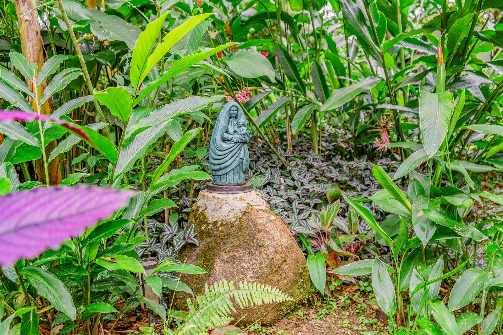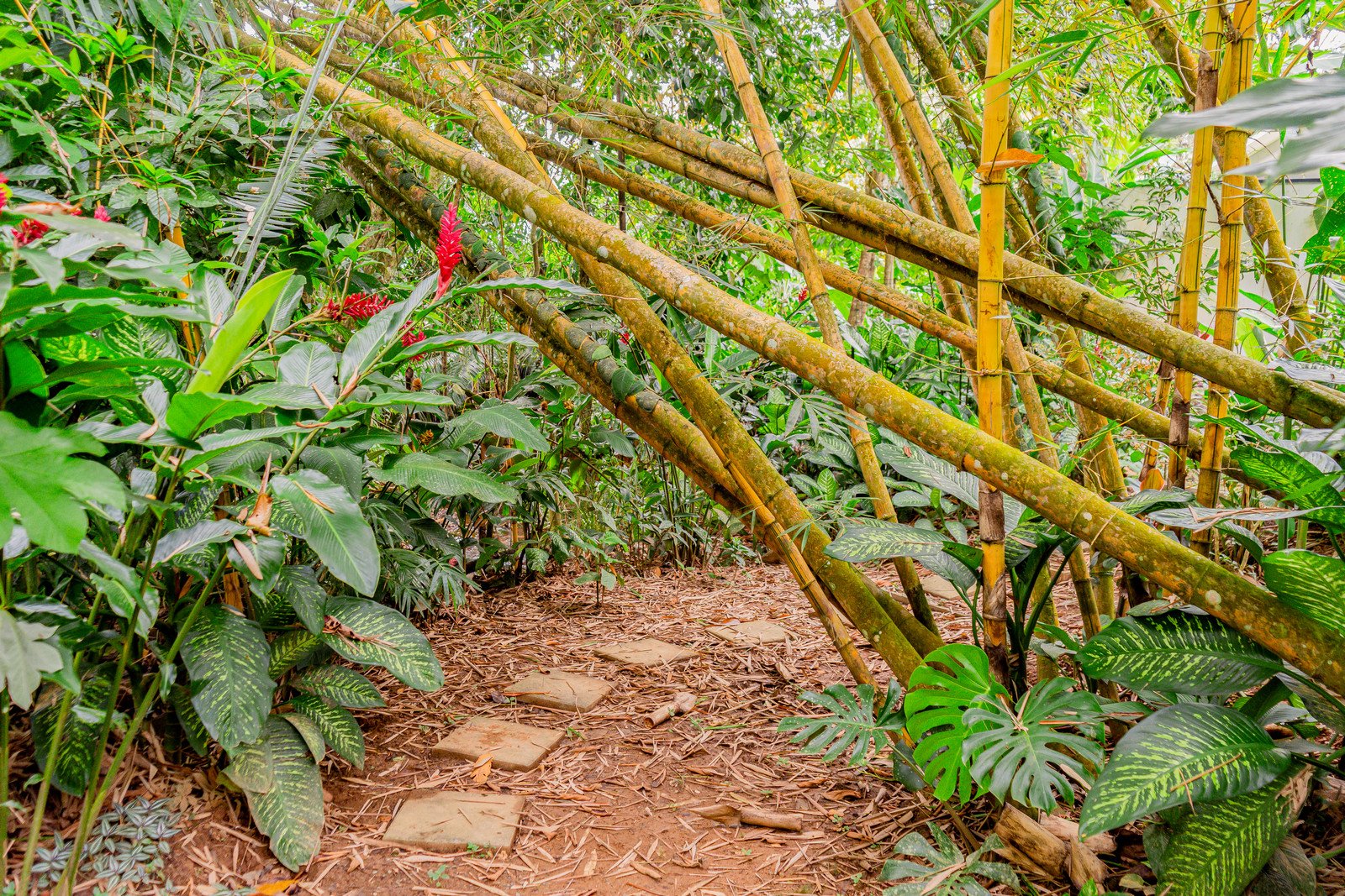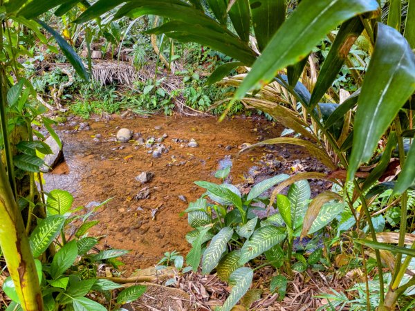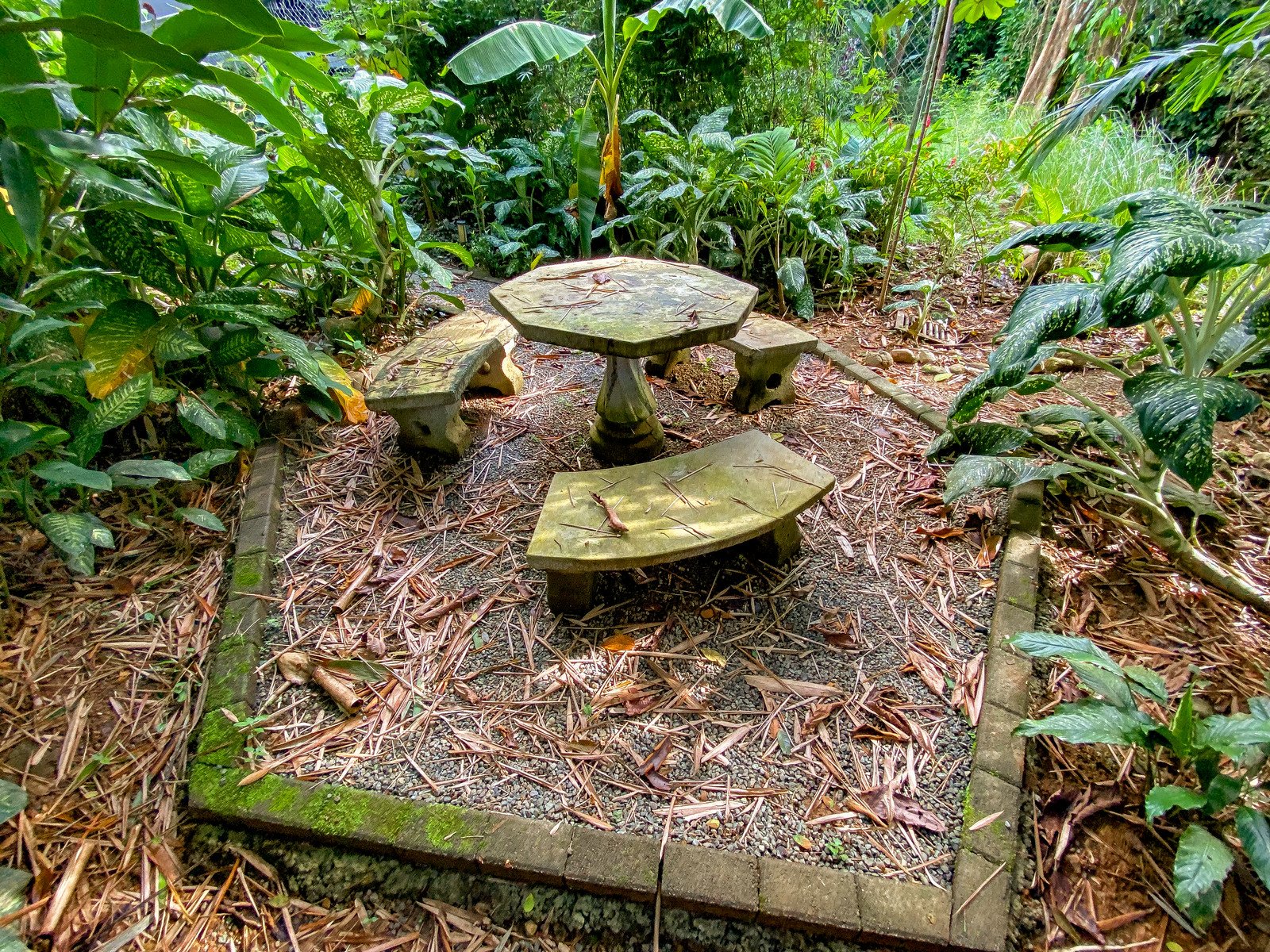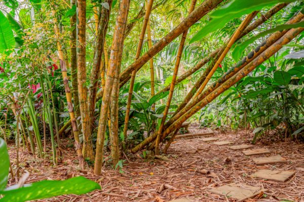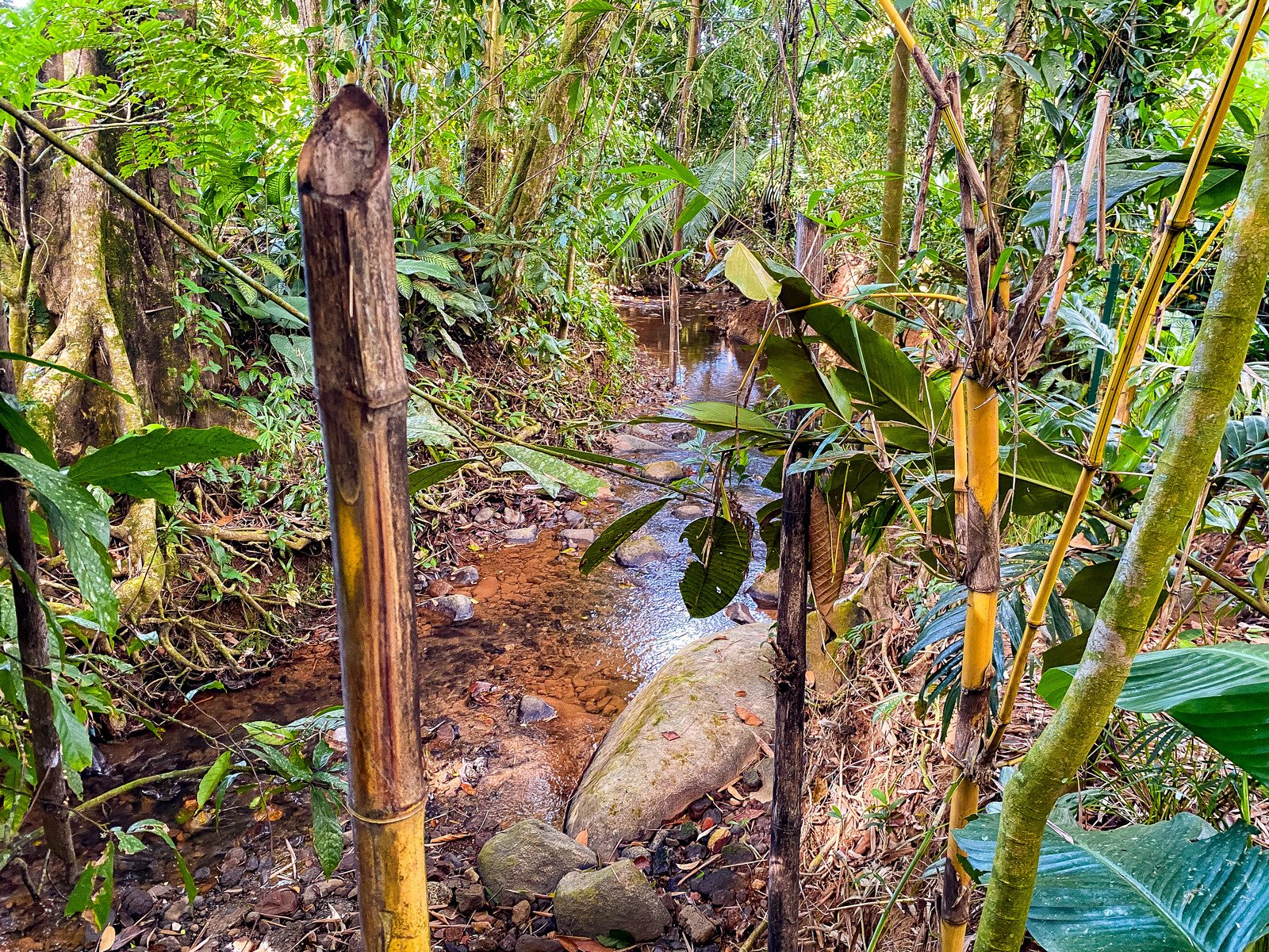 - Gravel and stepping-stone paths leading to a peaceful, unnamed creek surrounded by jungleÂ