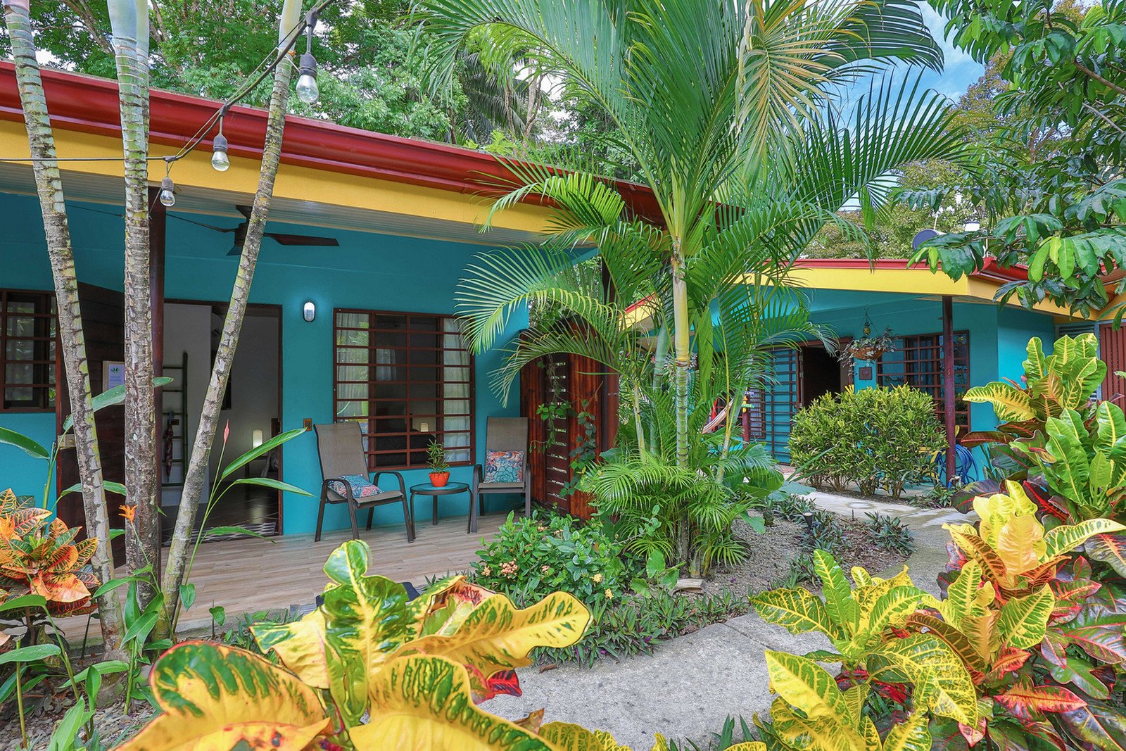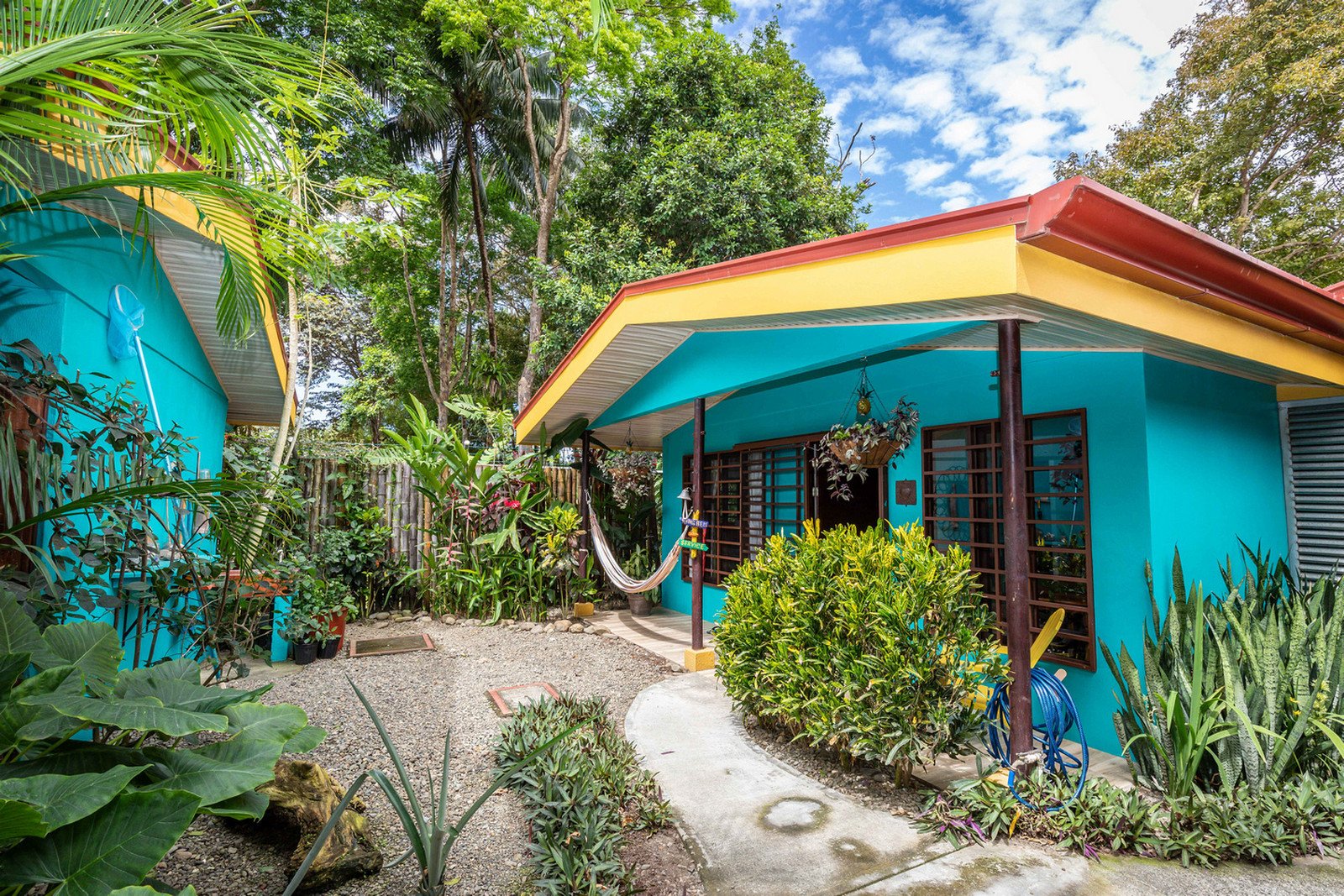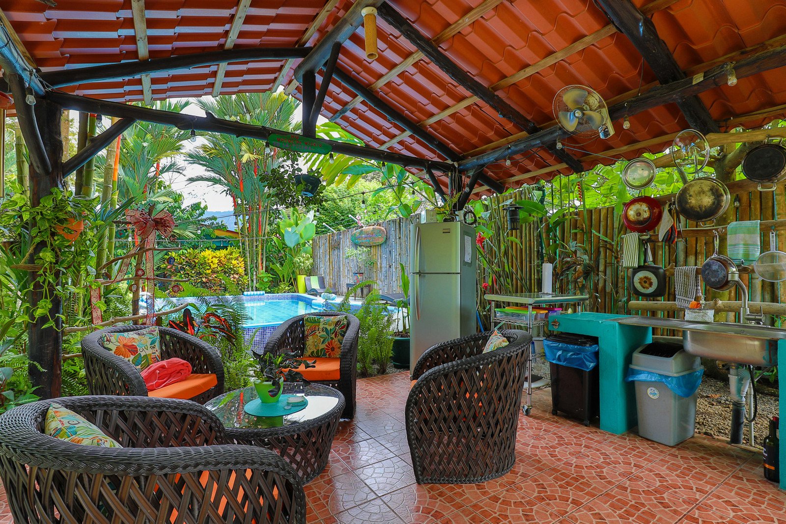 As you enter the electric bamboo gate to the property beyond the parking area there are 3 colorful rental units in a line to the left of the outdoor kitchen/rancho area and inviting pool.