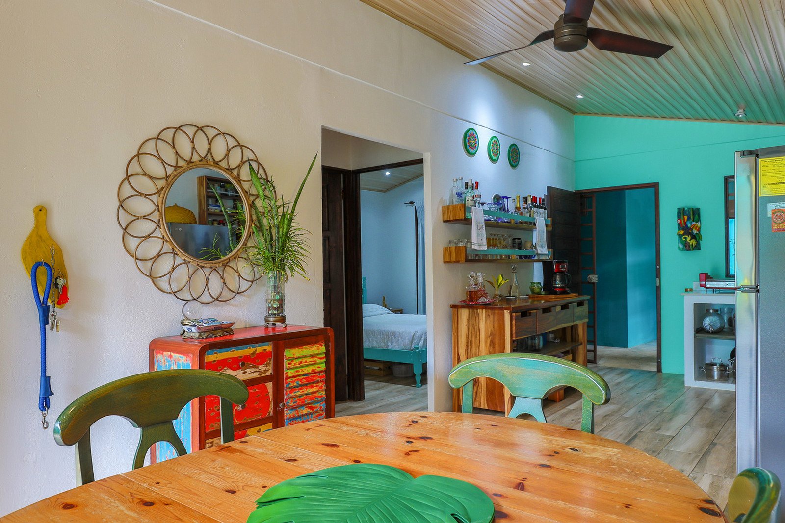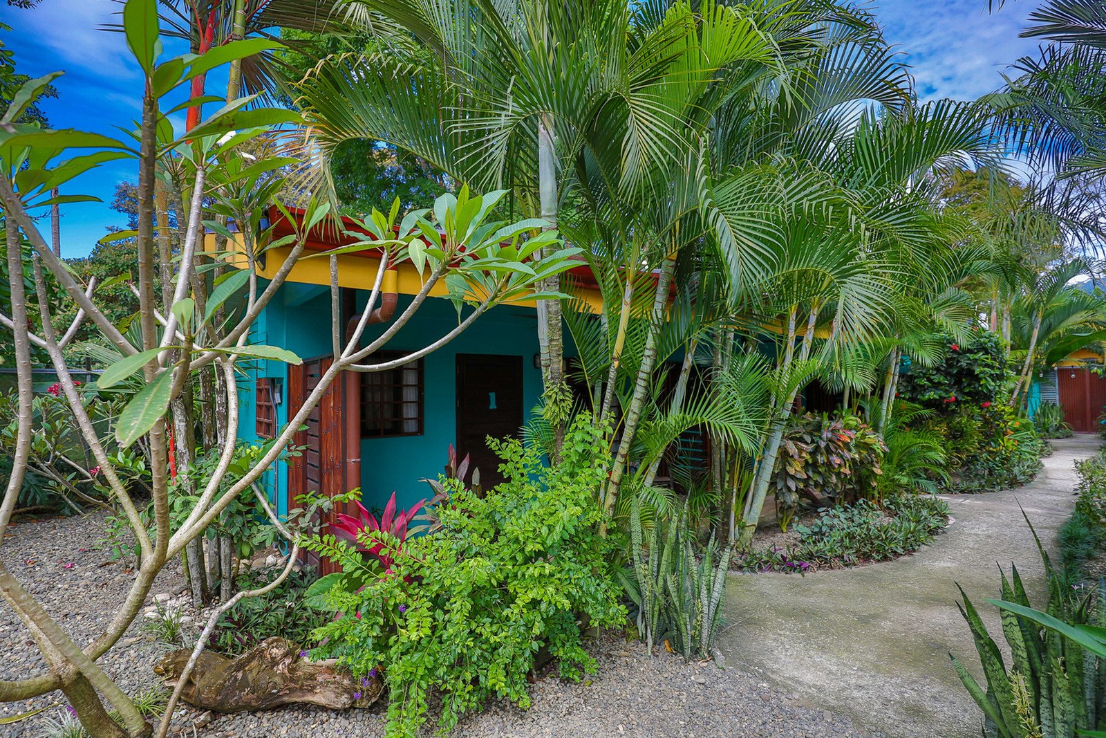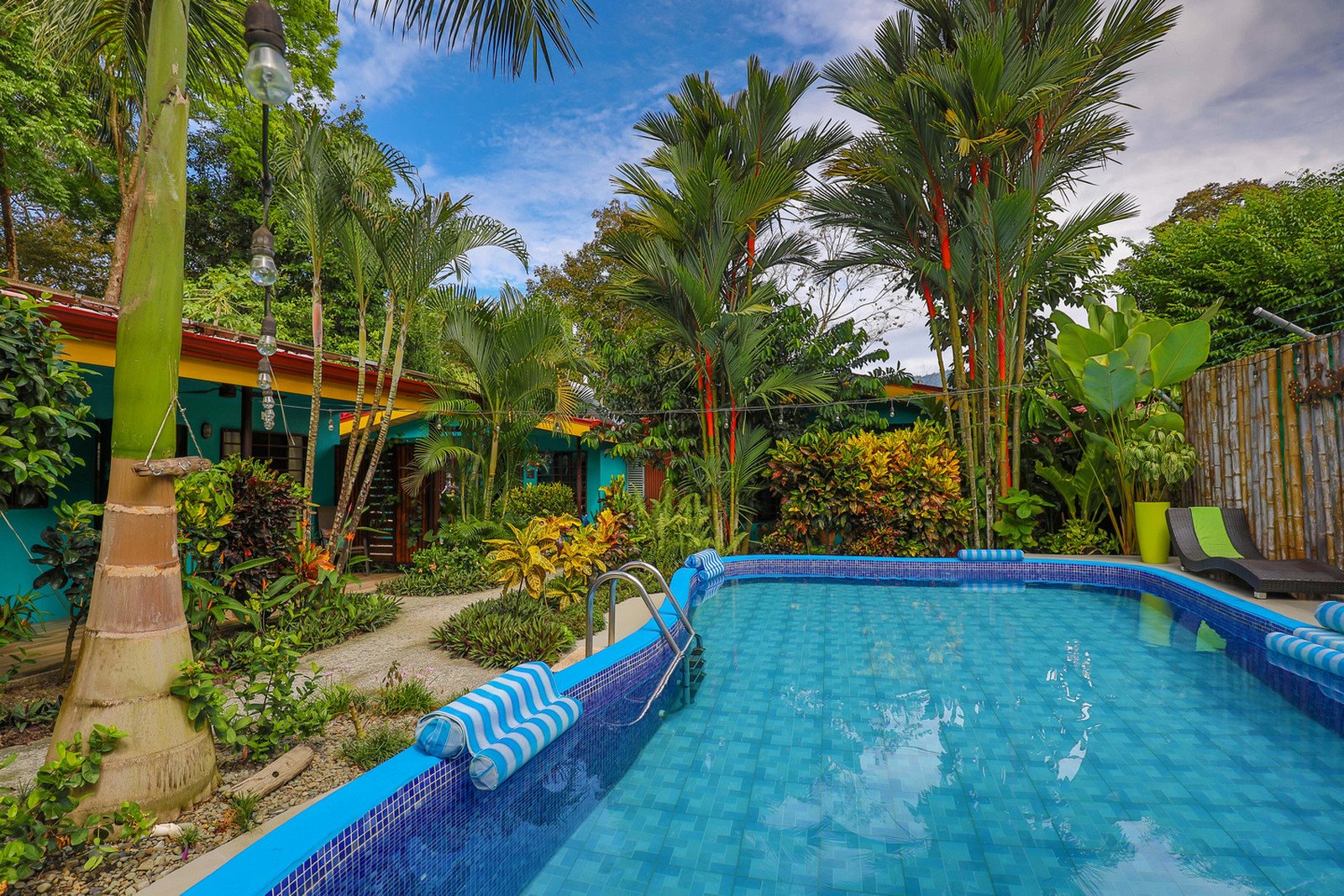 As you enter the electric bamboo gate to the property beyond the parking area there are 3 colorful rental units in a line to the left of the outdoor kitchen/rancho area and inviting pool.