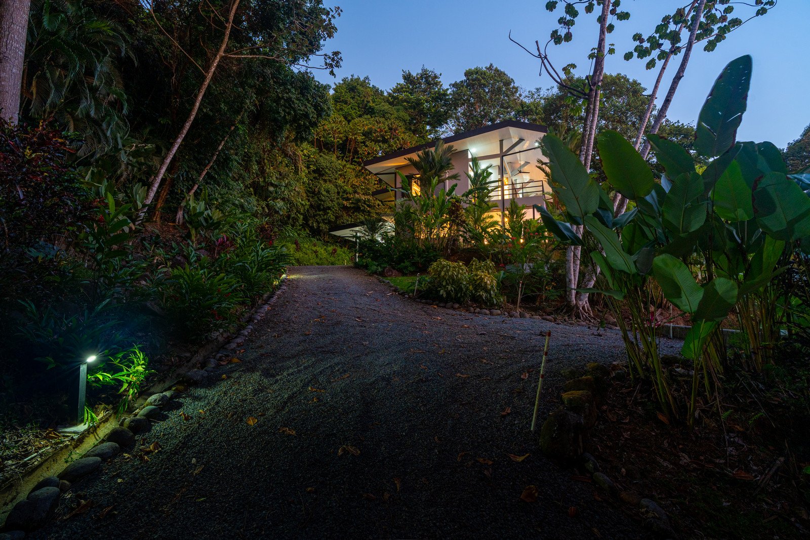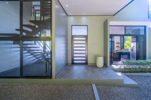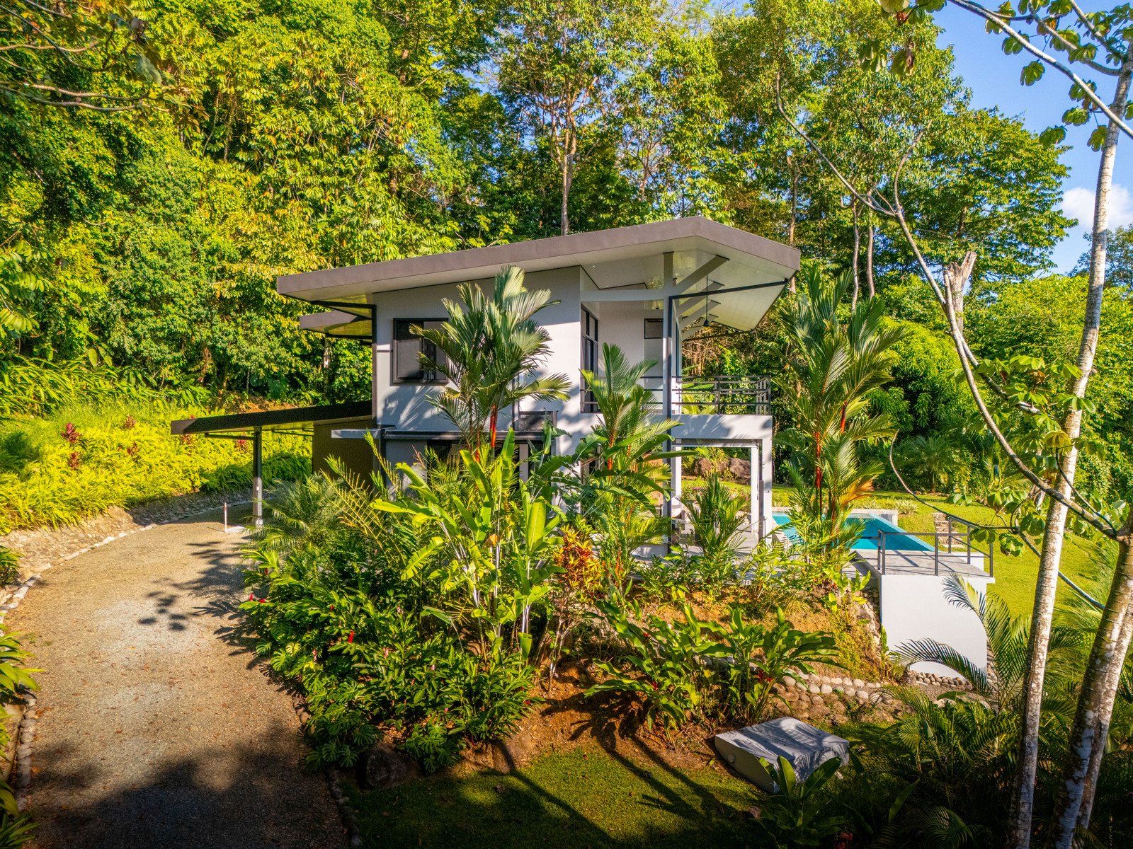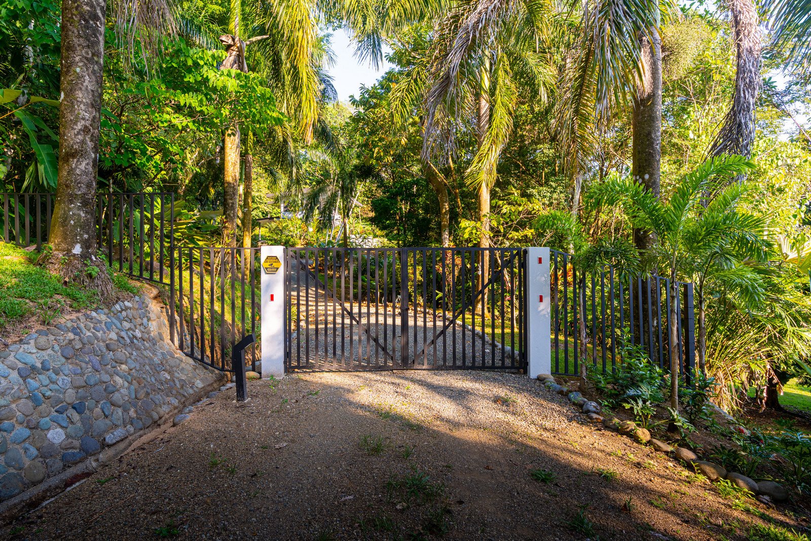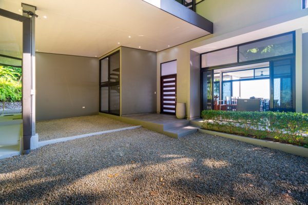 Set on approximately 1.29 acres of lush tropical land, the property greets you with an impressive entrance framed by mature flora and vibrant greenery. Situated at the end of a quiet road, the home enjoys exceptional privacy with no road noise. The surrounding green space not only ensures tranquility but also invites Costa Rica’s incredible wildlife to visit—monkeys, toucans, and scarlet macaws are frequent guests, creating the authentic nature experience the region is known for. A long gated driveway, beautifully illuminated at night, provides ample parking and adds to the estate-like feel of the property.