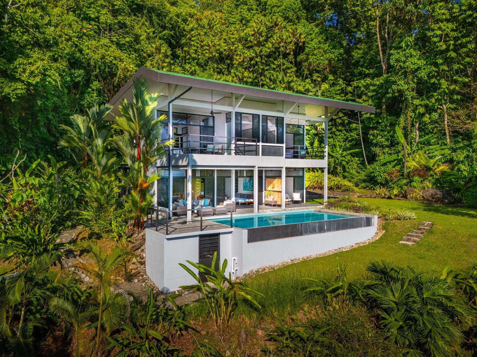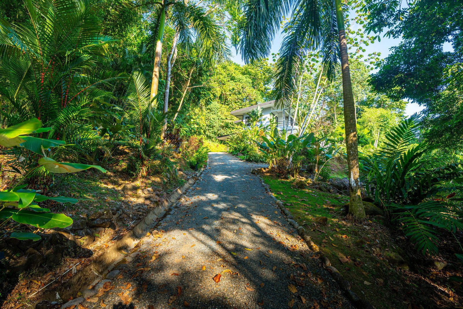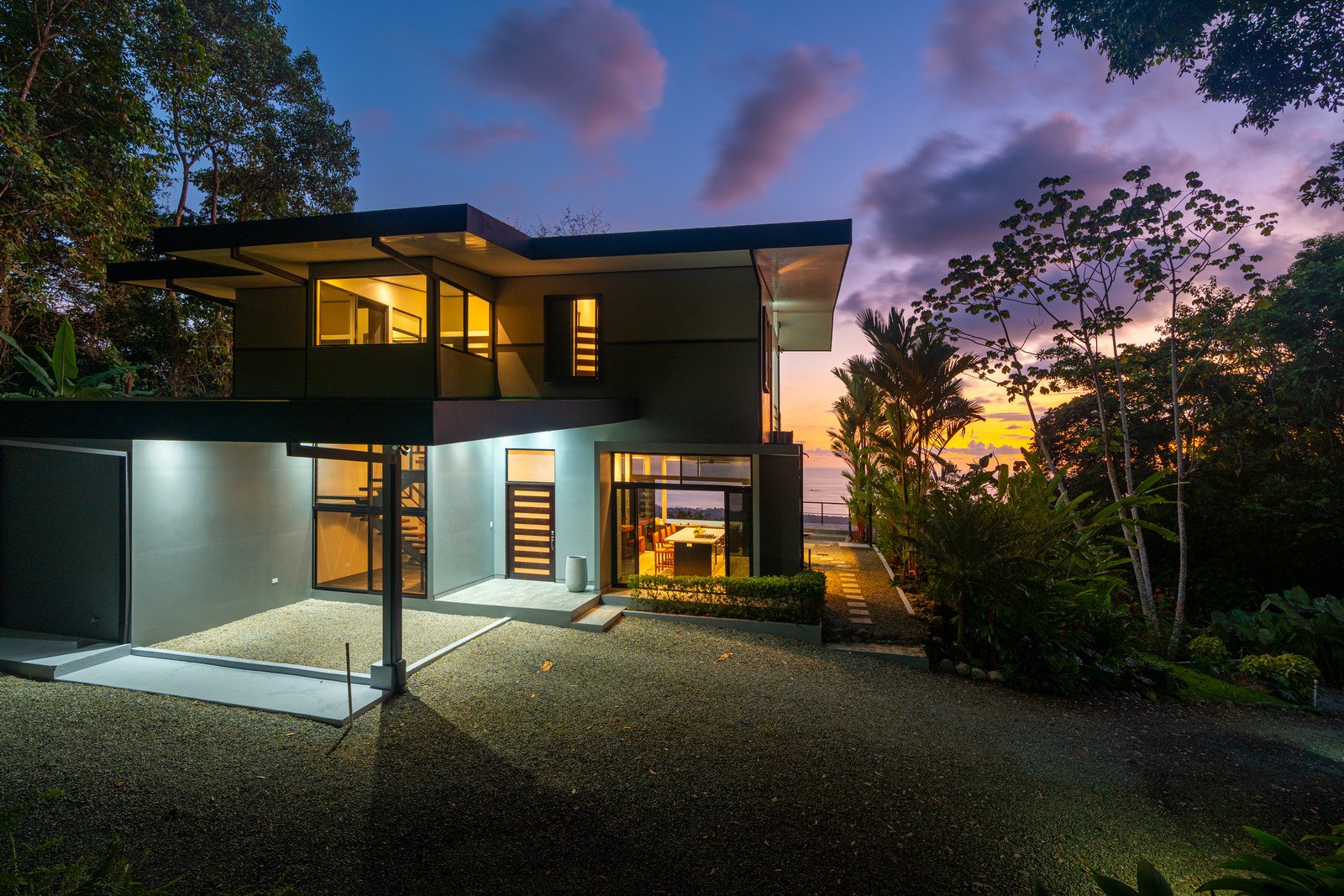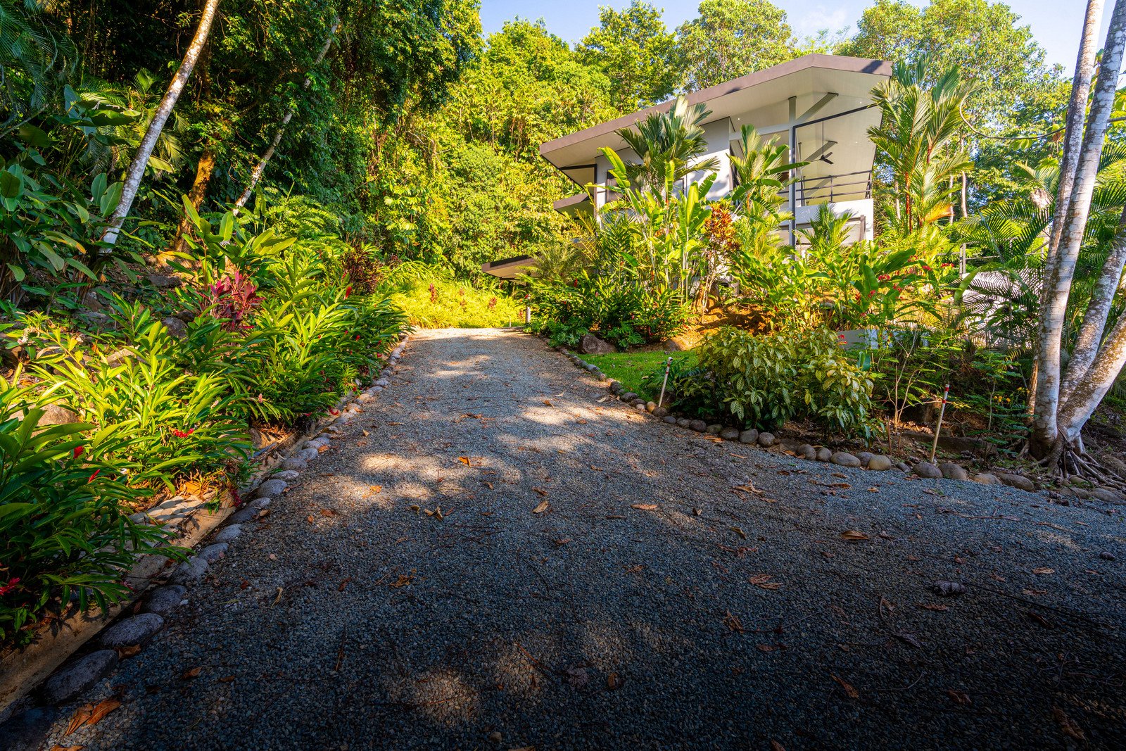 Set on approximately 1.29 acres of lush tropical land, the property greets you with an impressive entrance framed by mature flora and vibrant greenery. Situated at the end of a quiet road, the home enjoys exceptional privacy with no road noise. The surrounding green space not only ensures tranquility but also invites Costa Rica’s incredible wildlife to visit—monkeys, toucans, and scarlet macaws are frequent guests, creating the authentic nature experience the region is known for. A long gated driveway, beautifully illuminated at night, provides ample parking and adds to the estate-like feel of the property.