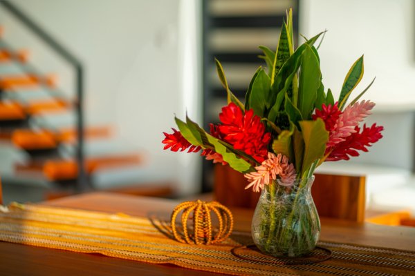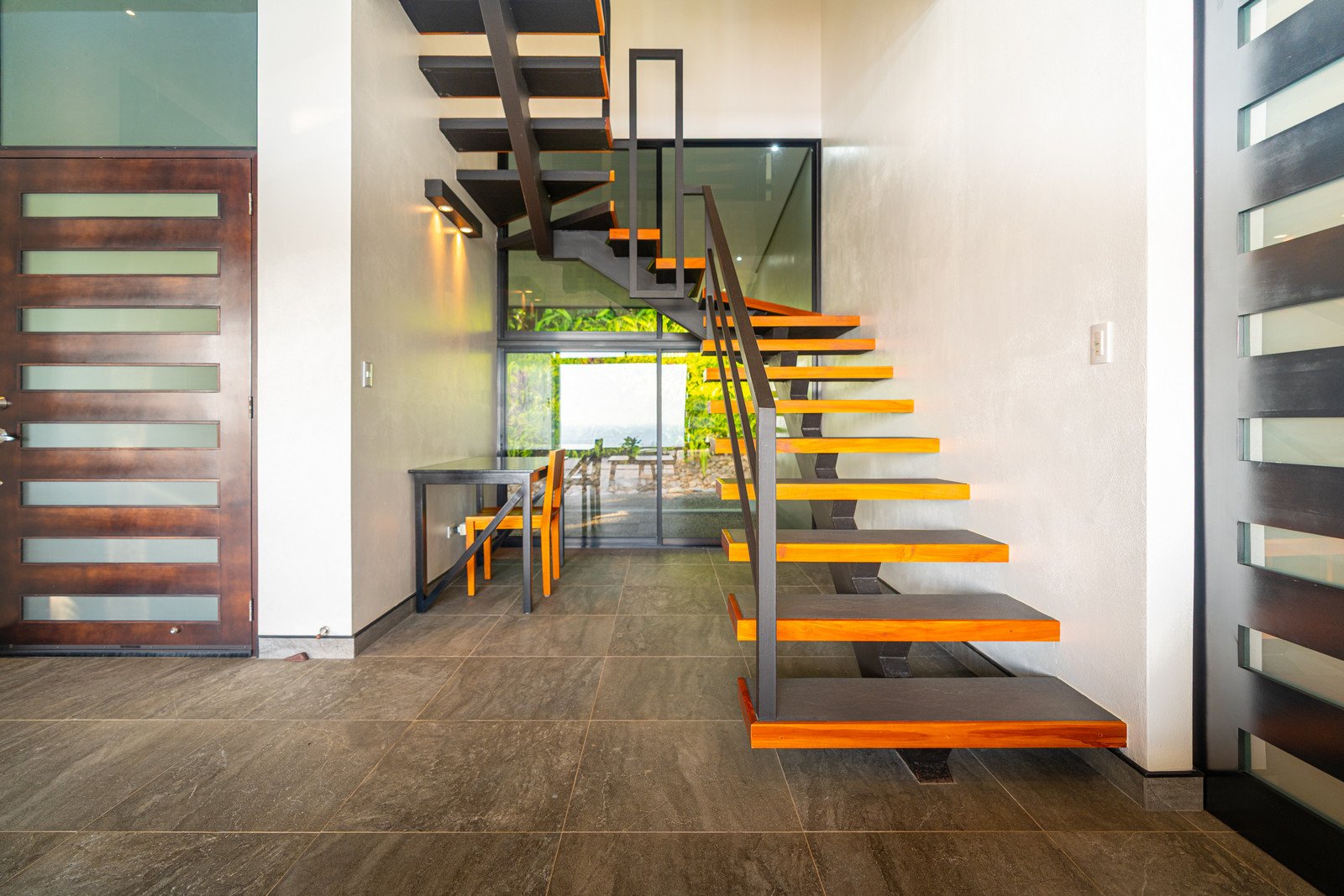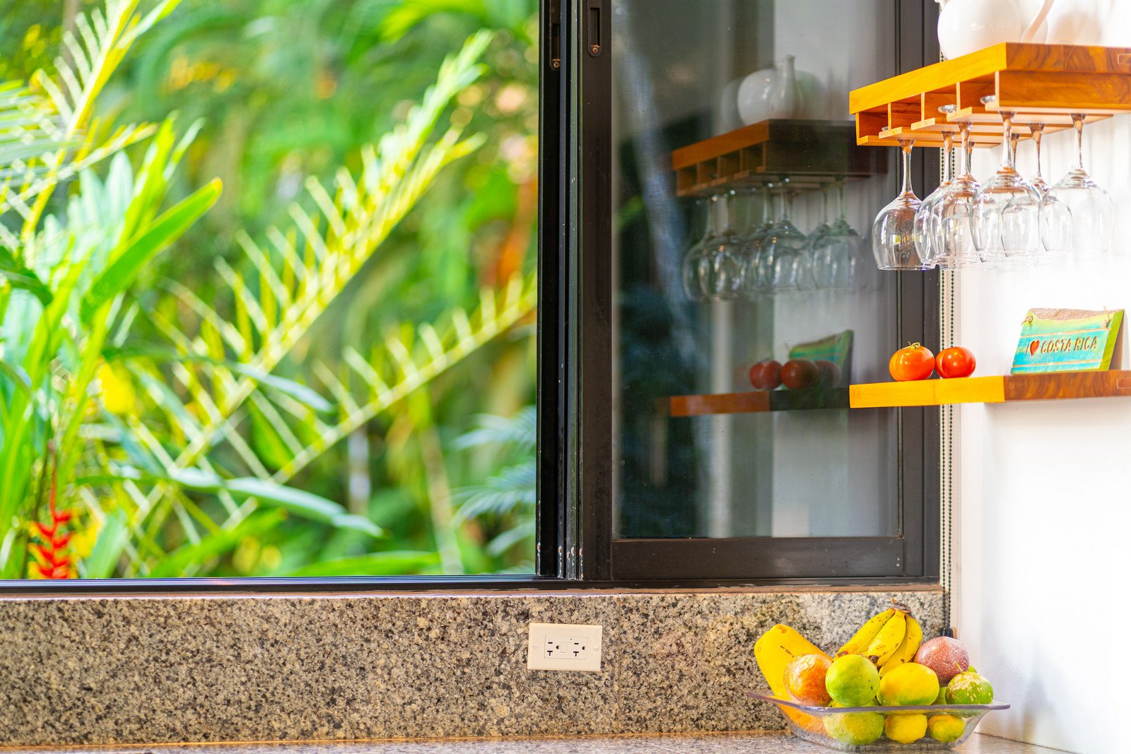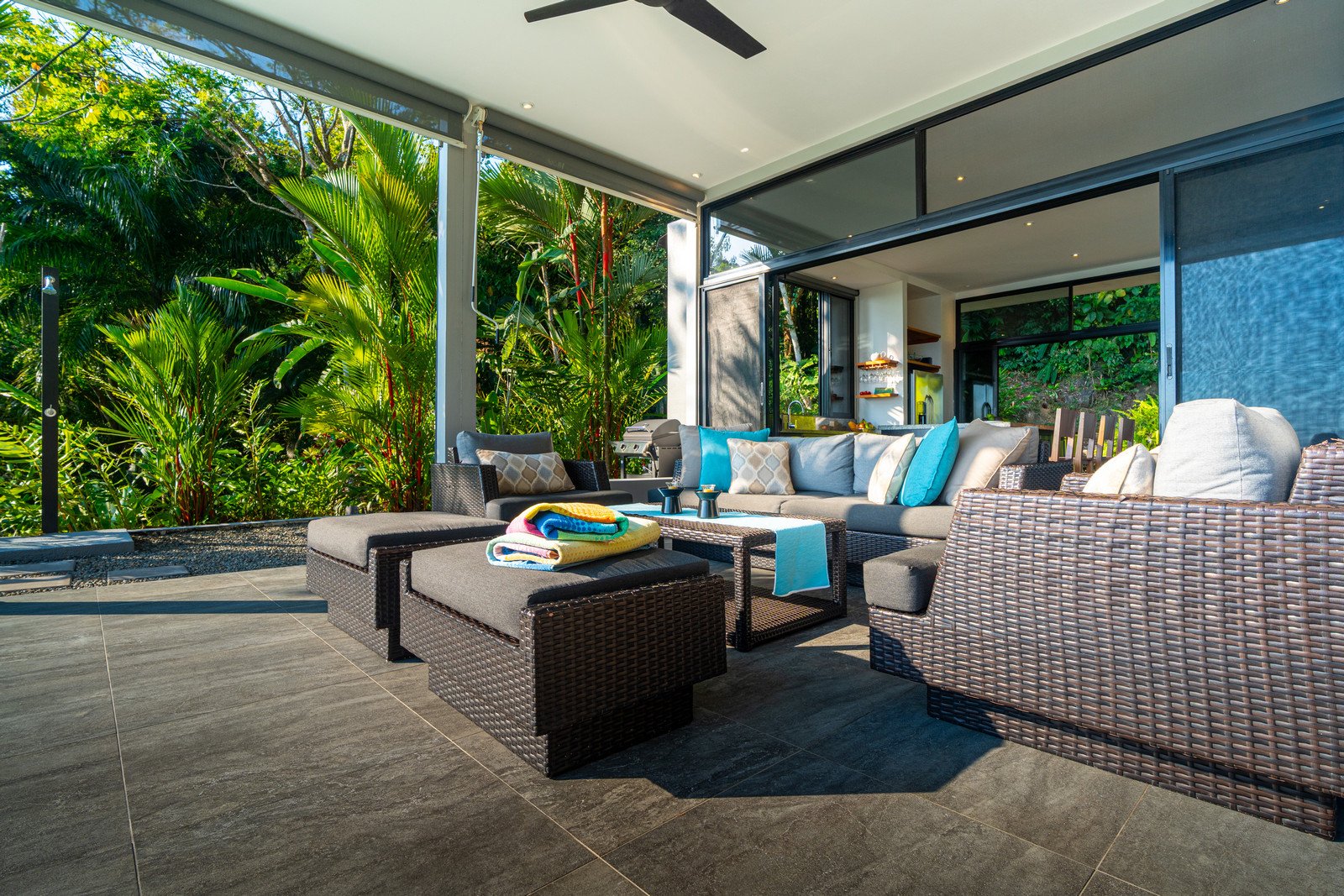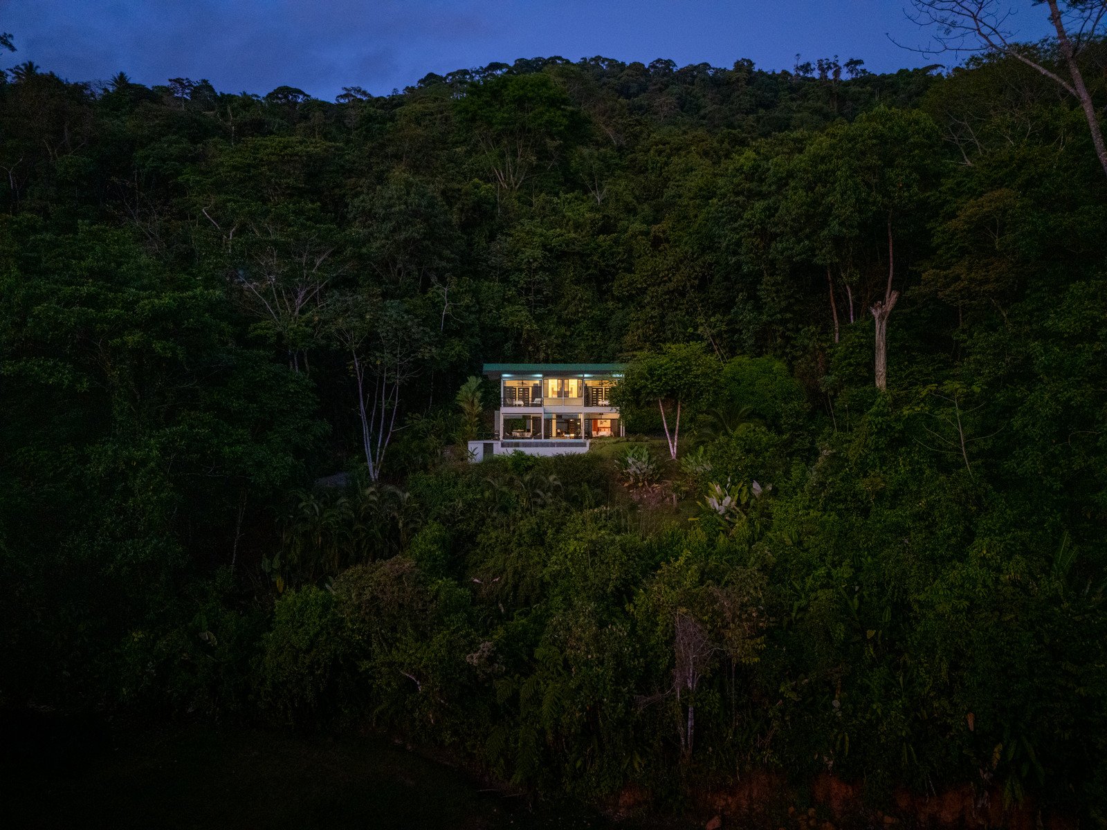 Set on approximately 1.29 acres of lush tropical land, the property greets you with an impressive entrance framed by mature flora and vibrant greenery. Situated at the end of a quiet road, the home enjoys exceptional privacy with no road noise. The surrounding green space not only ensures tranquility but also invites Costa Rica’s incredible wildlife to visit—monkeys, toucans, and scarlet macaws are frequent guests, creating the authentic nature experience the region is known for. A long gated driveway, beautifully illuminated at night, provides ample parking and adds to the estate-like feel of the property.