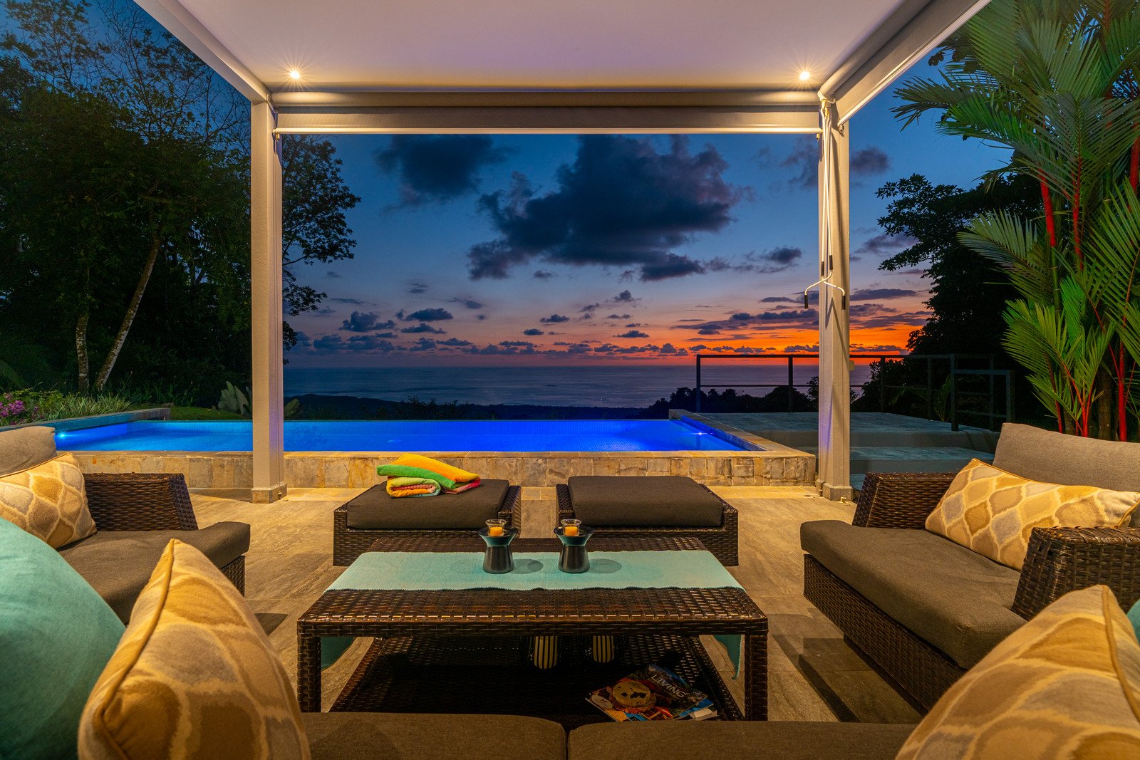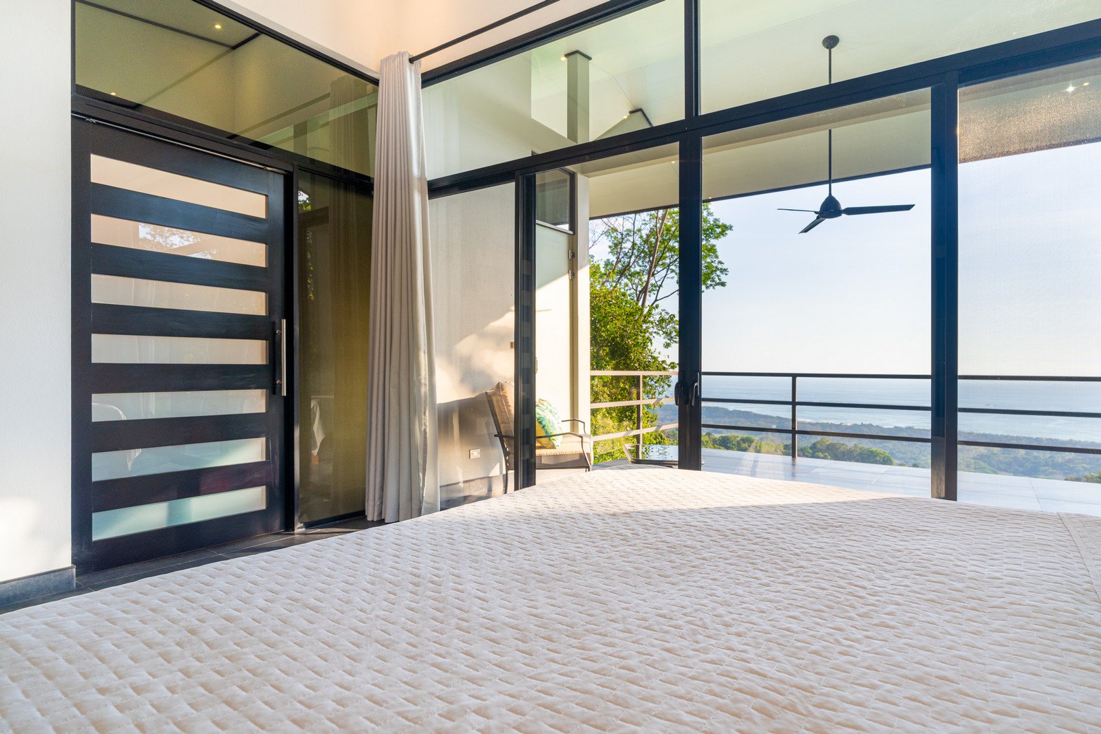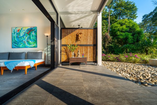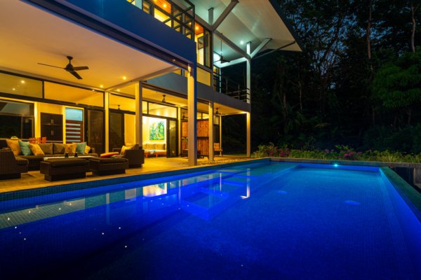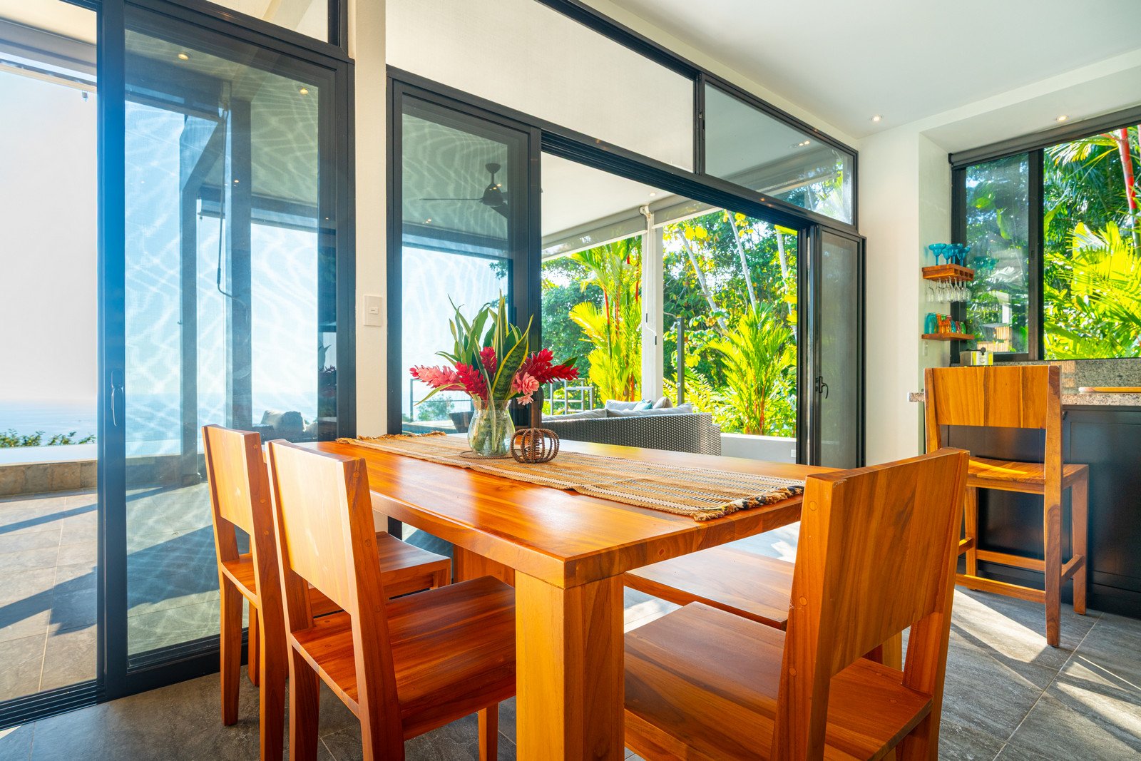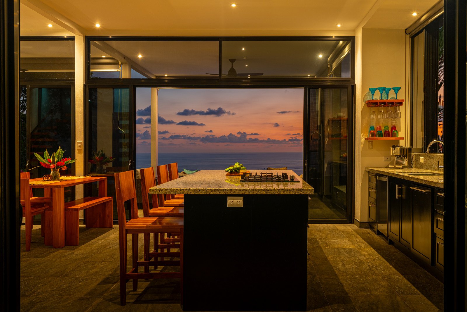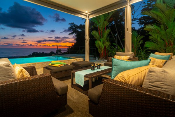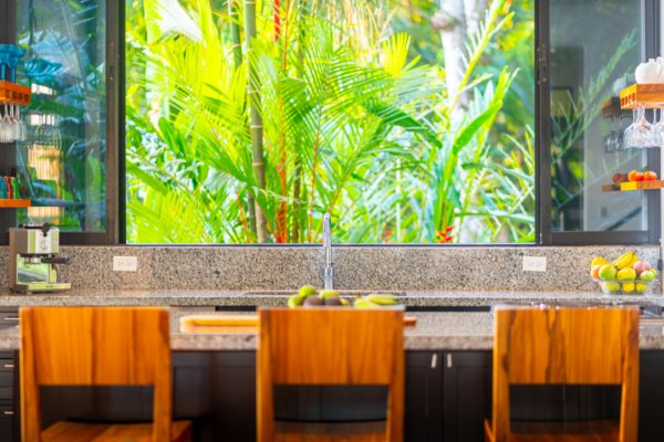 Expansive windows and sliding doors frame the ocean and jungle beyond while allowing the refreshing coastal breezes to flow naturally through the home—often making air conditioning unnecessary, though it is available for additional cooling when desired. The seamless indoor–outdoor design leads directly to a spectacular infinity-edge pool and a large covered outdoor lounge area, perfect for entertaining or simply relaxing while watching the sun dip into the Pacific.