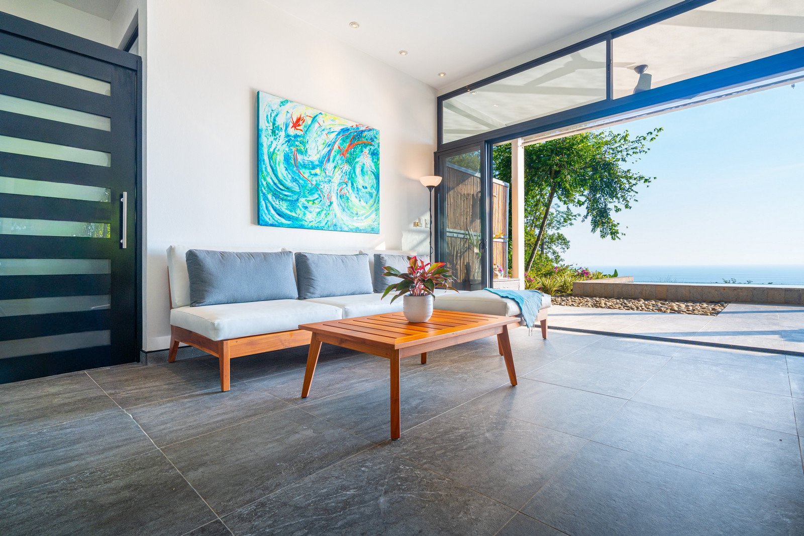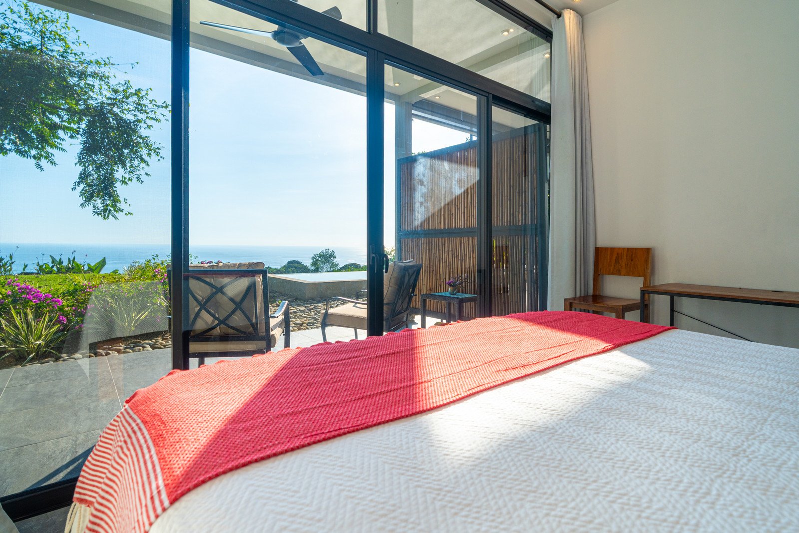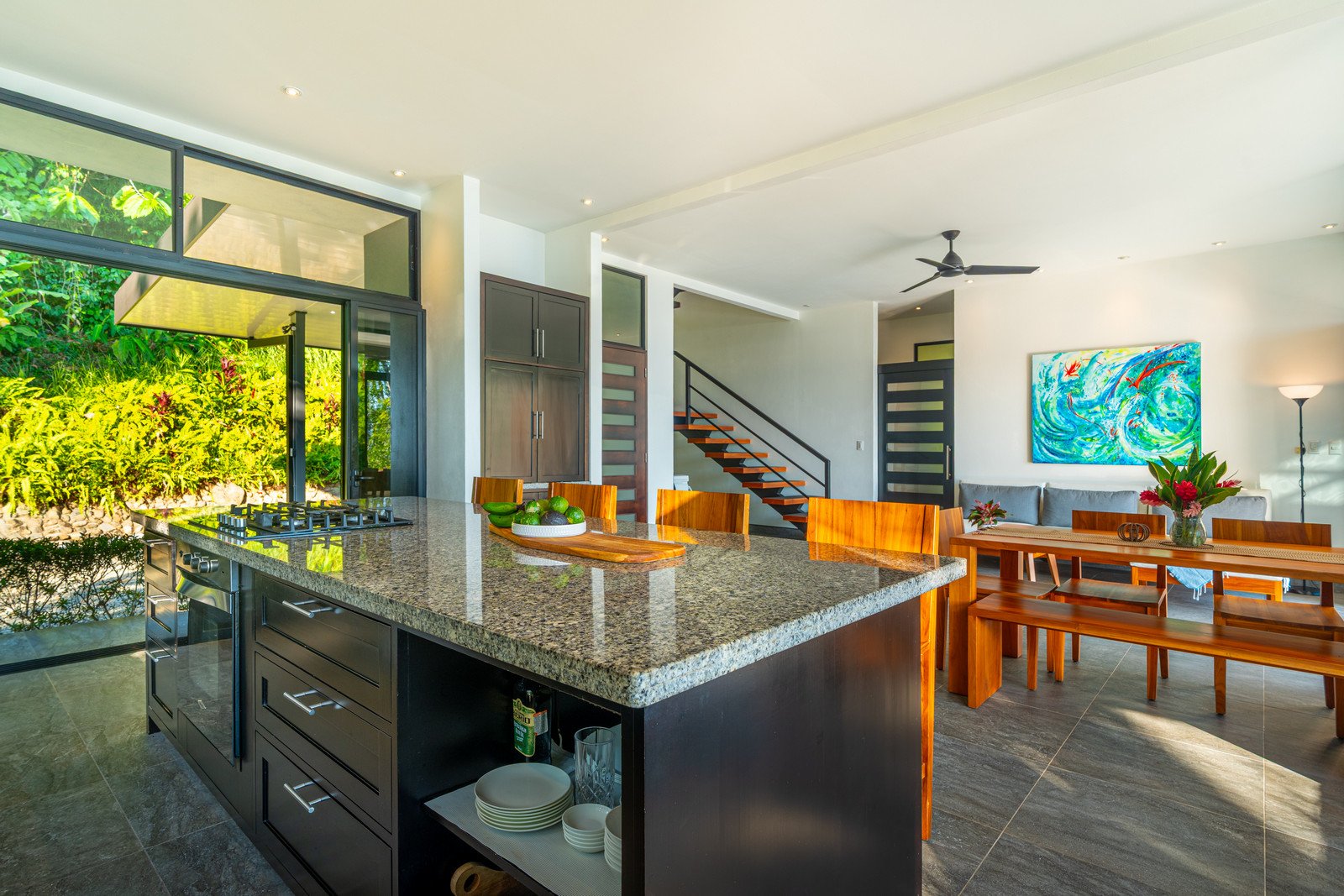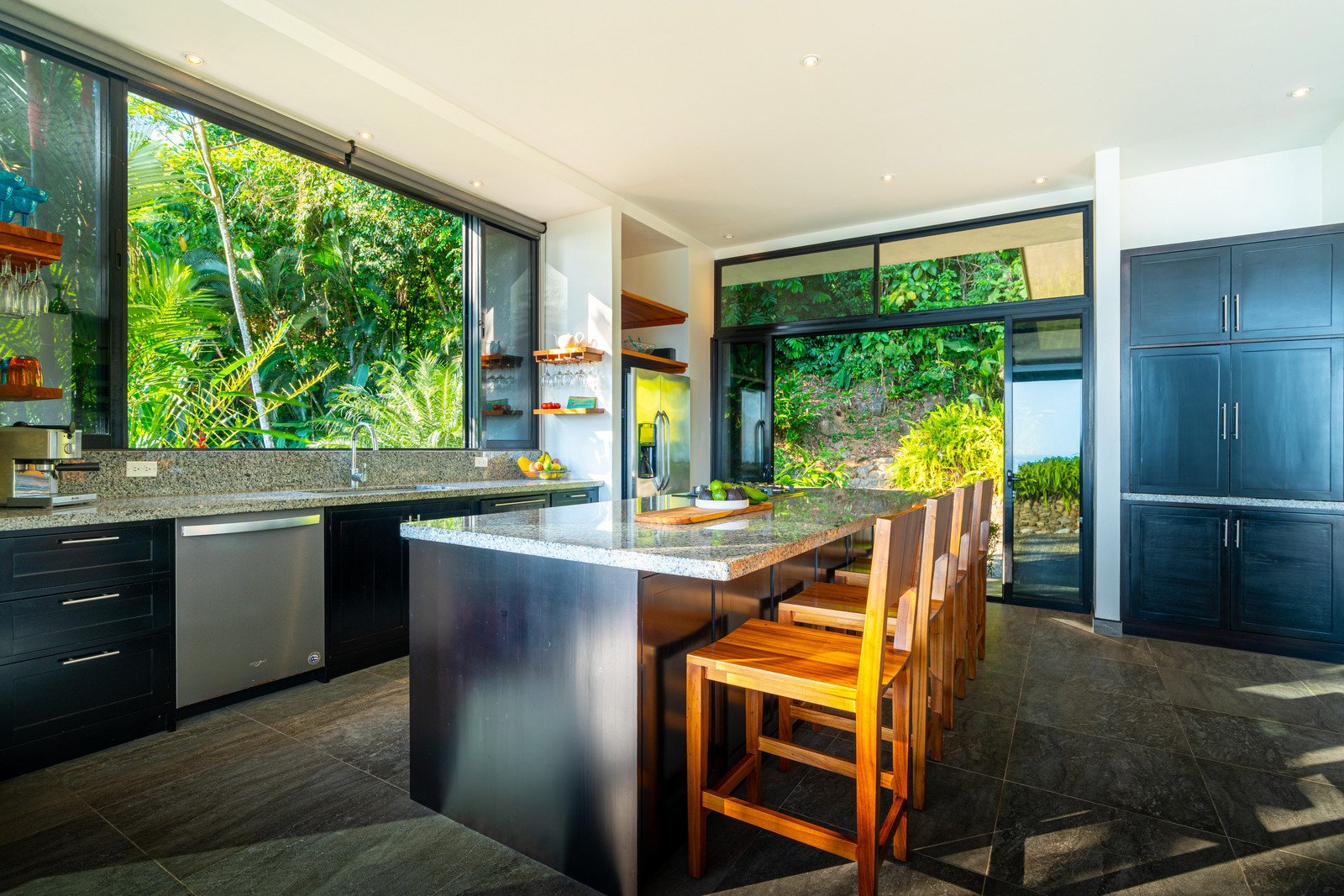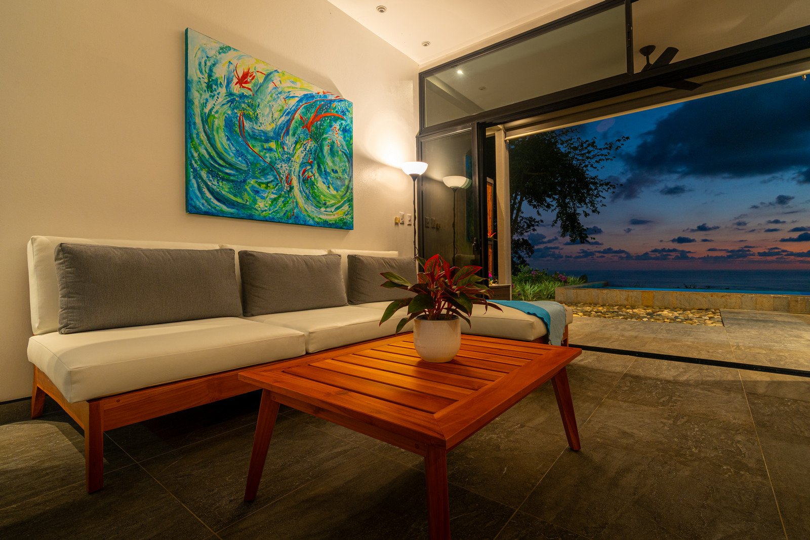 Expansive windows and sliding doors frame the ocean and jungle beyond while allowing the refreshing coastal breezes to flow naturally through the home—often making air conditioning unnecessary, though it is available for additional cooling when desired. The seamless indoor–outdoor design leads directly to a spectacular infinity-edge pool and a large covered outdoor lounge area, perfect for entertaining or simply relaxing while watching the sun dip into the Pacific.