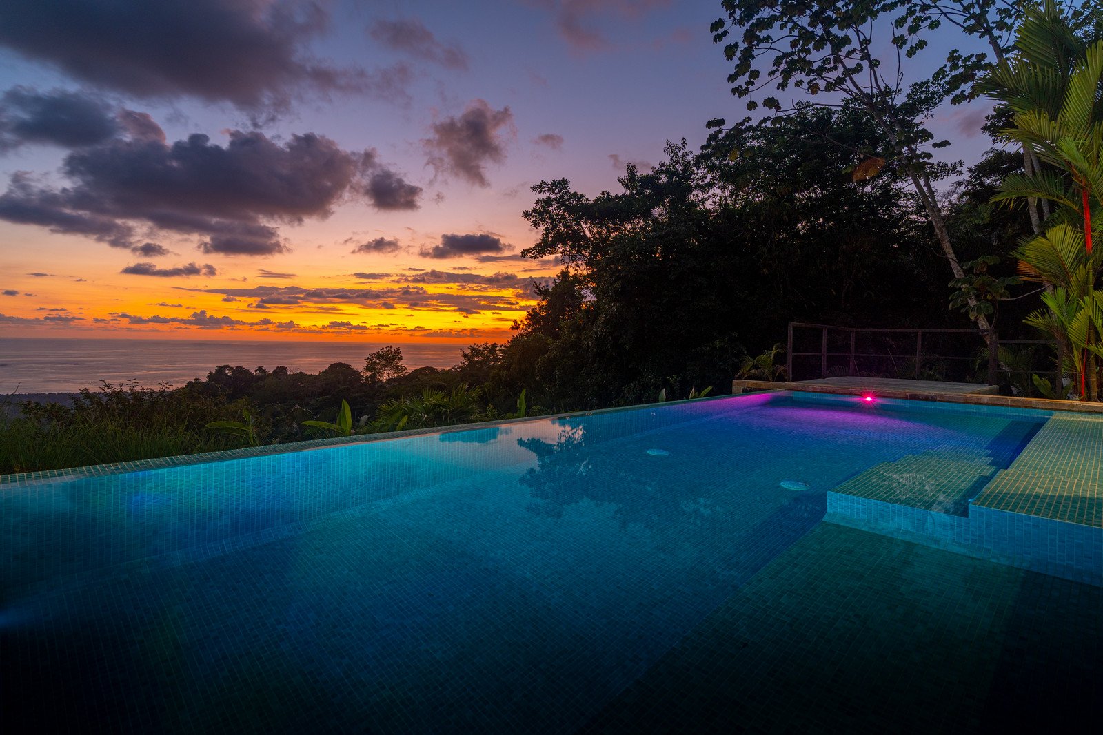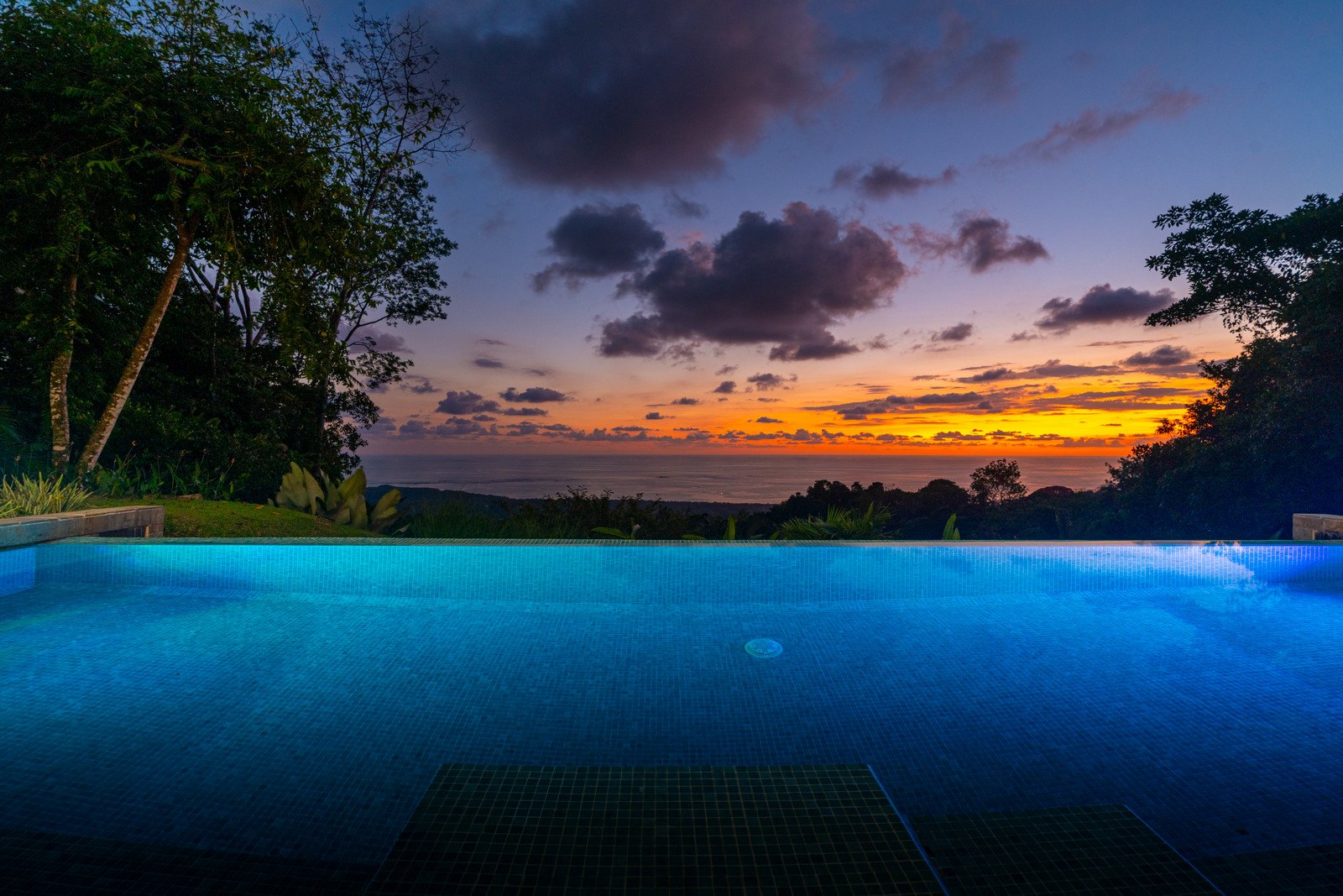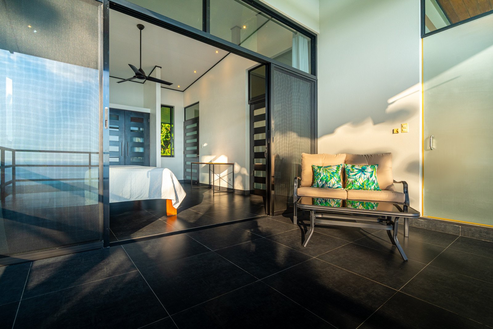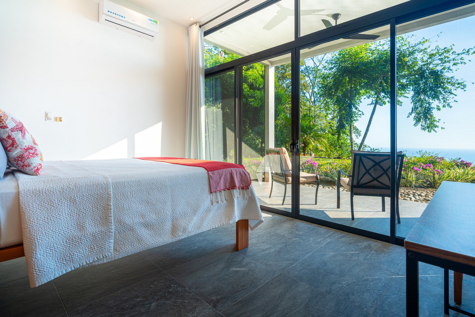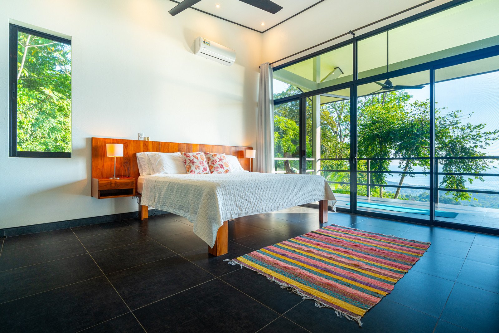Expansive windows and sliding doors frame the ocean and jungle beyond while allowing the refreshing coastal breezes to flow naturally through the home—often making air conditioning unnecessary, though it is available for additional cooling when desired. The seamless indoor–outdoor design leads directly to a spectacular infinity-edge pool and a large covered outdoor lounge area, perfect for entertaining or simply relaxing while watching the sun dip into the Pacific.