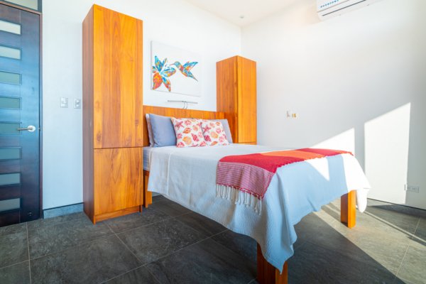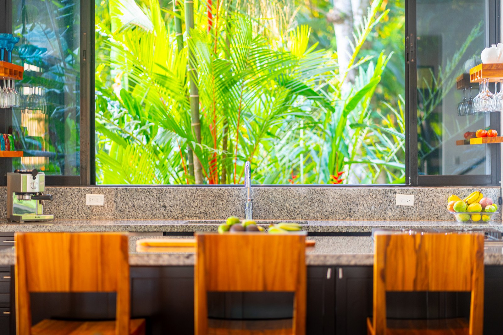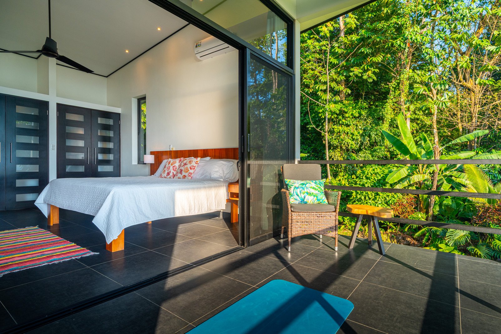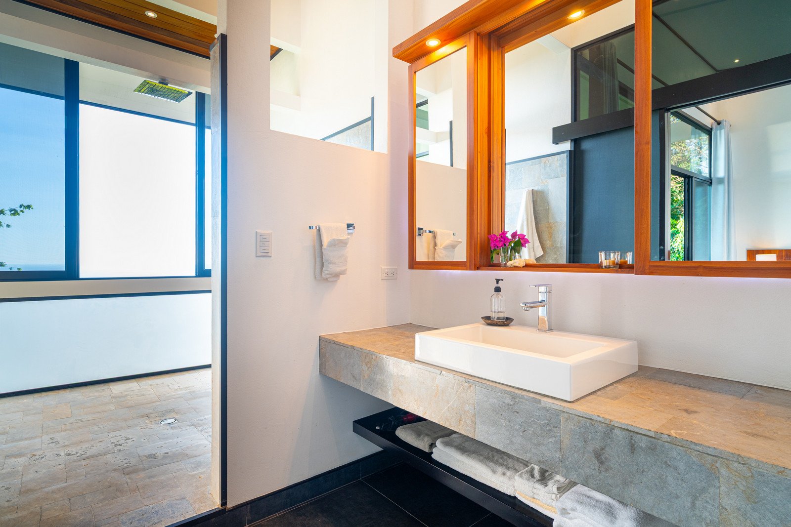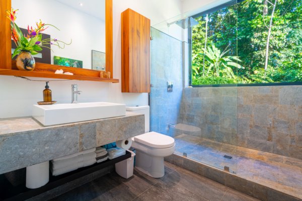 One of the home’s master suites is conveniently located on the main level and enjoys its own private patio overlooking the infinity pool and surrounding jungle. The ensuite bathroom is designed to feel like a personal spa, with a large picture window that brings the outside in. Nearby, the main-floor laundry room and a separate utility and storage area provide practical convenience. This space can be locked off from the main house while still offering exterior access—ideal for storing surfboards, beach gear, or outdoor equipment without bringing them inside.