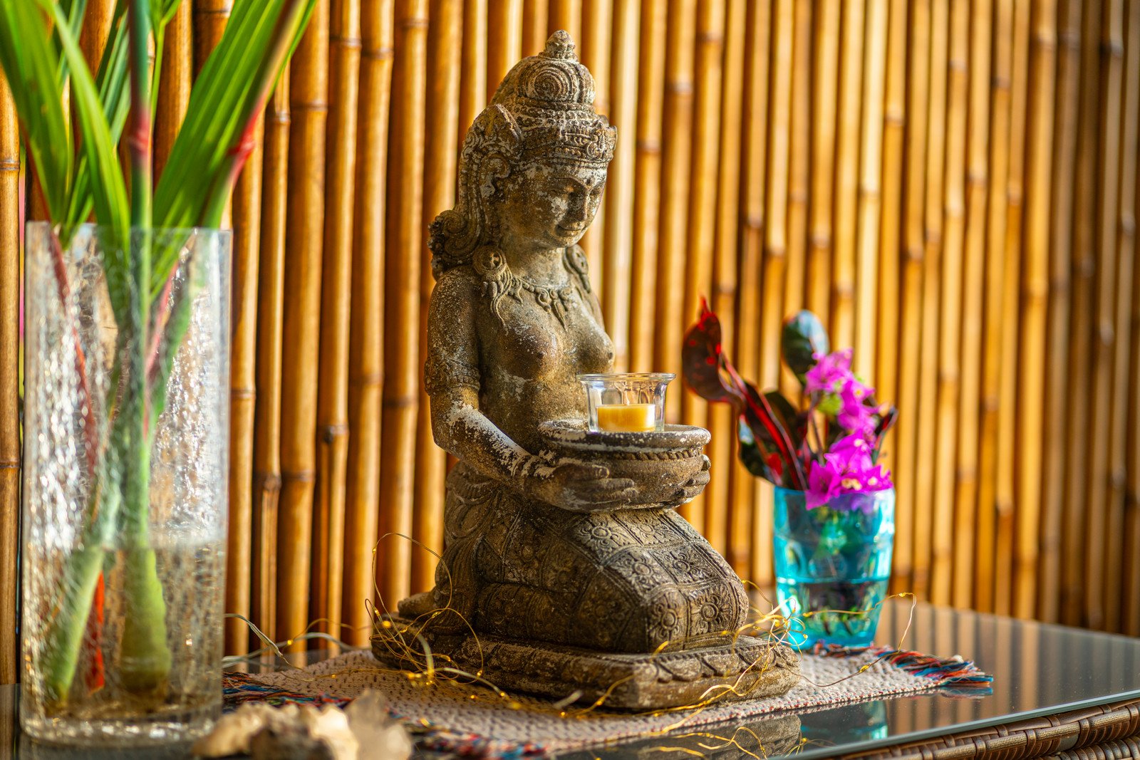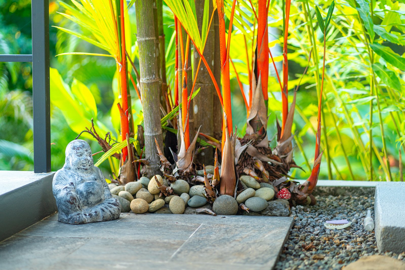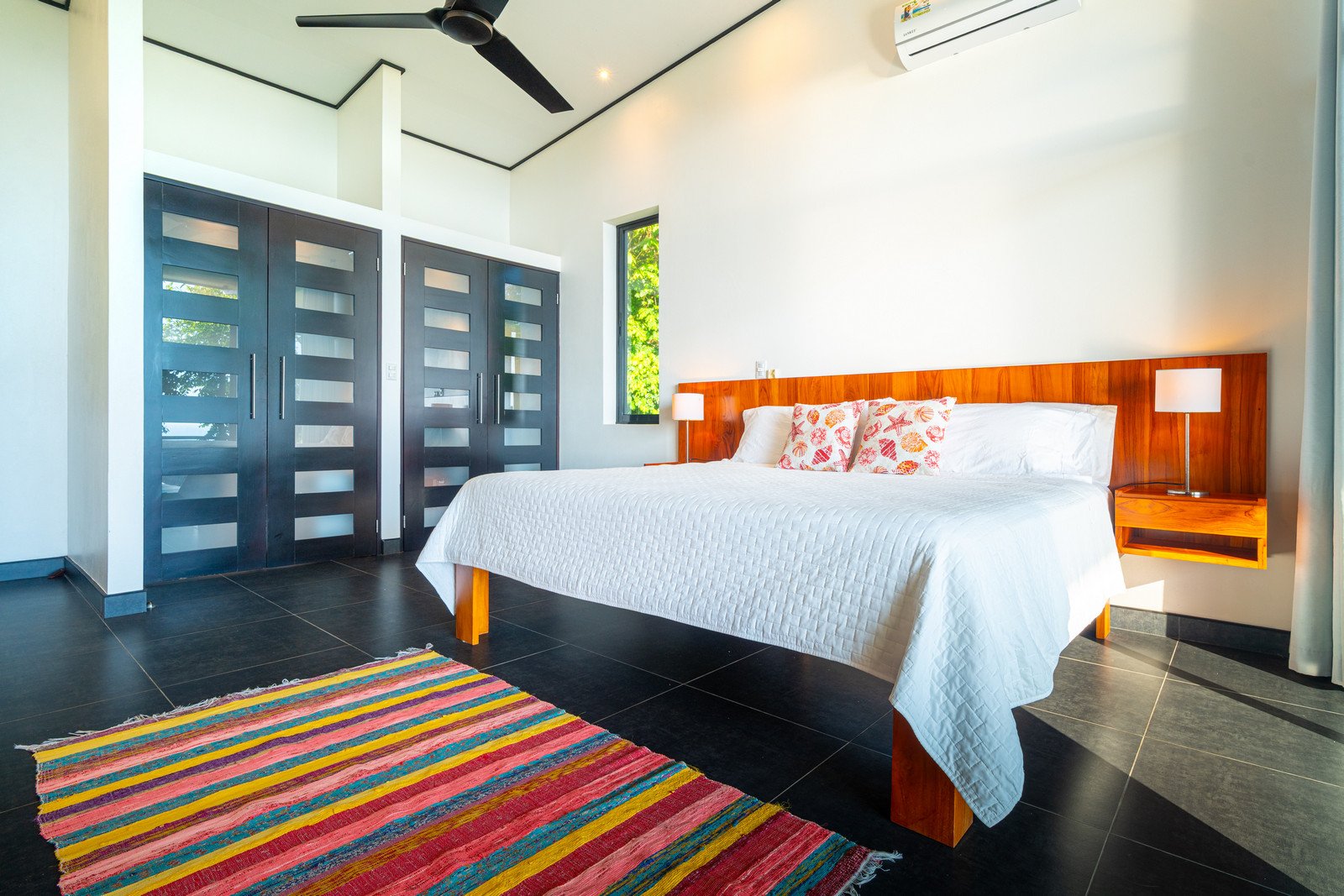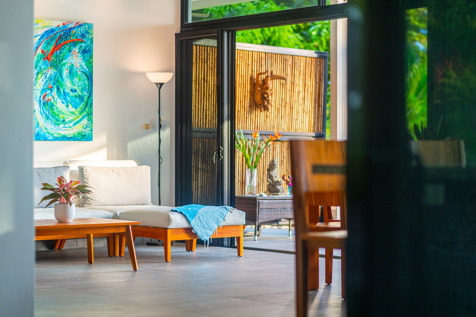 One of the home’s master suites is conveniently located on the main level and enjoys its own private patio overlooking the infinity pool and surrounding jungle. The ensuite bathroom is designed to feel like a personal spa, with a large picture window that brings the outside in. Nearby, the main-floor laundry room and a separate utility and storage area provide practical convenience. This space can be locked off from the main house while still offering exterior access—ideal for storing surfboards, beach gear, or outdoor equipment without bringing them inside.